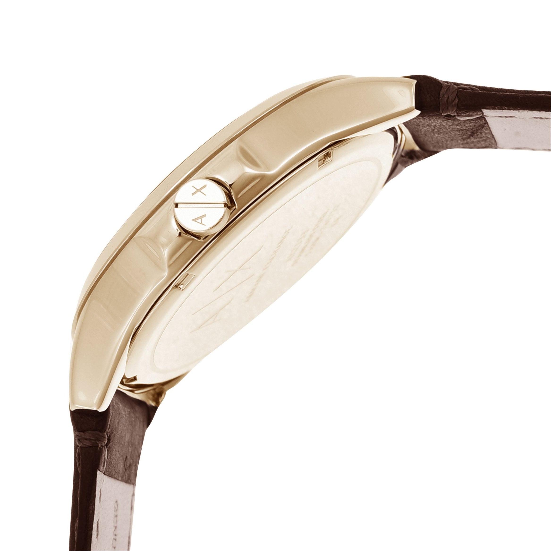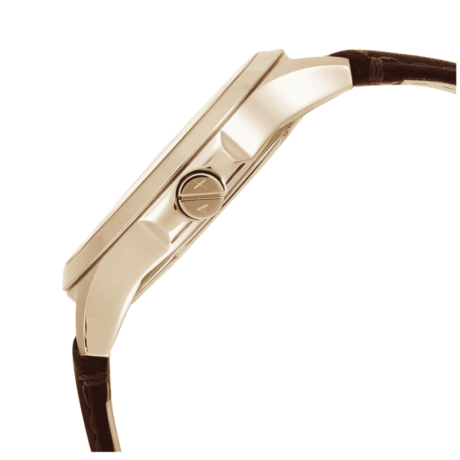 This watch features a textured blue dial which is encased in a rose-gold toned case. It has three rose-gold toned hand movements with a date window and brown leather two-piece strap secured by a prong strap buckle, this Armani Exchange watch is a cut above the rest.