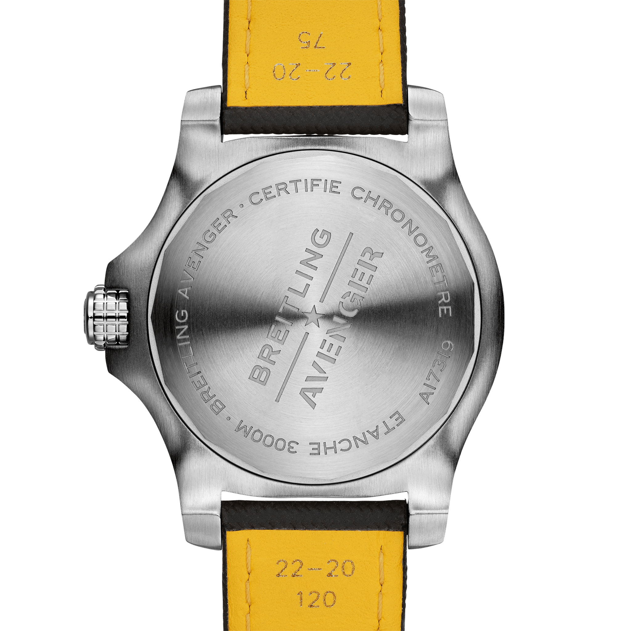 Bold, extremely robust and shock resistant, the Avenger Automatic 45 Seawolf is a pilots’ watch prepared for adventures well below the ocean’s surface (up to 300 bars - 3.000m). As a true Breitling Avenger, it can be used wearing gloves and offers unrivalled safety and reliability to any airborne adventurer. The Avenger Automatic 45 Seawolf features a sturdy 45mm stainless-steel case, striking yellow dial and a choice of a stainless-steel bracelet, or black military leather strap that fits either a stainless-steel pin buckle or folding clasp. With an impressive water resistance, the Seawolf is at ease up in the air and deep down the oceans. Thanks to its rugged bezel and its special grip-pattern on the crown, the Avenger Automatic 45 Seawolf can be easily operated wearing gloves.