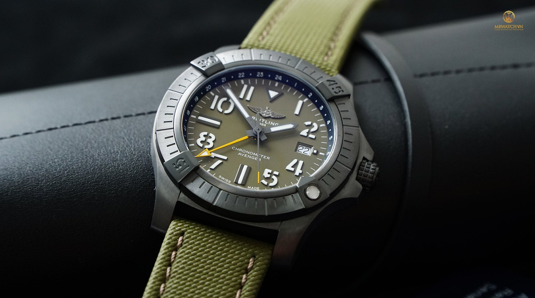 Bold, extremely robust and shock resistant, the Avenger Automatic GMT 45 Night Mission features a lightweight case and an additional yellow hand indicating a second time zone. As a true Breitling Avenger, it can be used wearing gloves and offers unrivalled safety and reliability to any airborne adventurer. Limited to 2000 pieces. The Night Mission interpretation of the Avenger Automatic GMT 45 features a sturdy 45mm DLC-coated titanium case, green dial and a green-colored military leather strap that fits either a DLC-coated stainless-steel pin buckle or folding clasp. Its specific Arabic numerals recall the stenciled numbers used on the decks of aircraft carriers. Thanks to its rugged bezel and its special grip-pattern on the crown, the Avenger Automatic GMT 45 Night Mission can be easily operated wearing gloves.