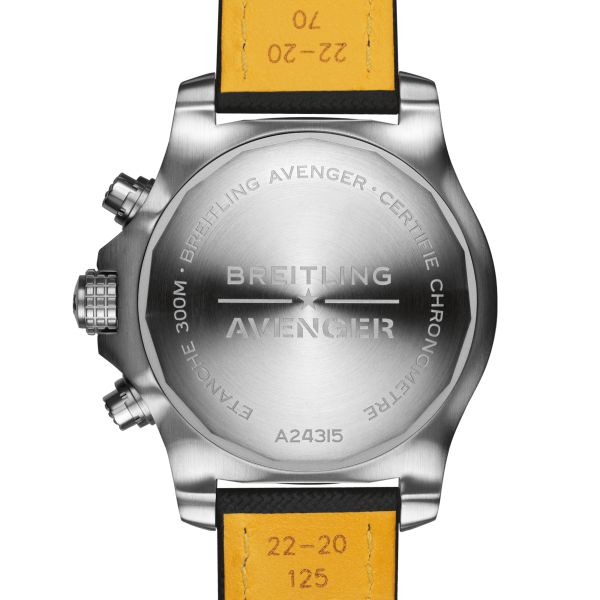 Bold, extremely robust and shock resistant, the Avenger Chronograph GMT 45 combines precision with a powerful design. As a true Breitling Avenger, it offers unrivalled safety and reliability to any airborne adventurer. The Avenger Chronograph GMT 45 features a sturdy 45mm stainless-steel case, black dial and a choice of a stainless-steel bracelet or matching military leather strap. Thanks to its rugged bezel and its special grip-pattern on the crown and chronograph pushers, the Avenger Chronograph GMT 45 can be easily operated wearing gloves.