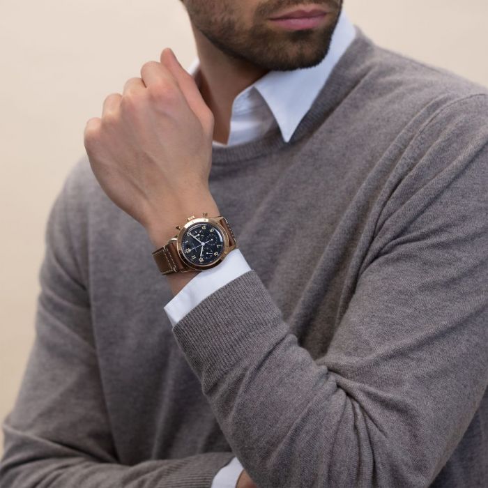 The hand-applied Super-LumiNova color has been carefully chosen to recall the original luminescent material and gives the AVI 1953 Edition an additional touch of vintage allure. The AVI 1953 Edition features a 41mm 18k red gold case with a water resistance up to 3 bar (30 meters). The AVI 1953 Edition is powered by the in-house Breitling Manufacture Caliber B09, a hand-wound COSC-certified caliber based on the renowned Breitling Caliber 01. It is available on a brown vintage-inspired leather strap with an 18k red gold pin buckle as a limited-edition of 253 pieces, each of which is engraved “ONE OF 253”.