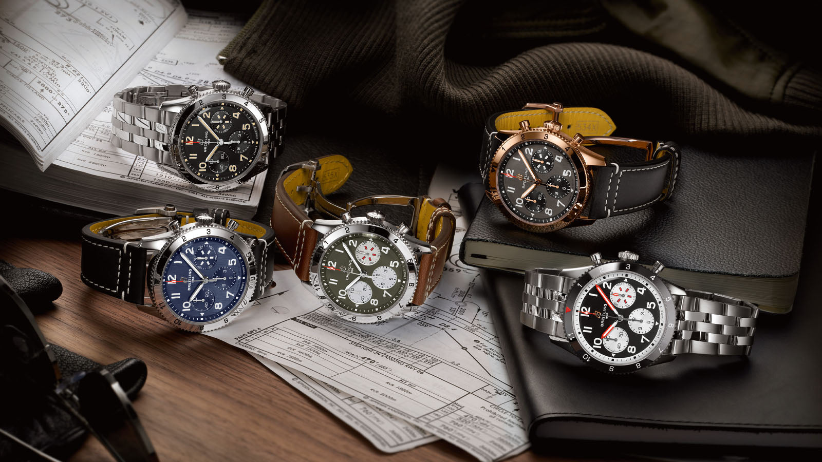 The Ref. 765 AVI 1964 Re-Edition, released in a limited production of 164 pieces, faithfully reproduces the Ref. 765 AVI’s design. It includes a true-to-the-time hesalite crystal, as well as the baton indexes and lumed pencil hands used on the original. It also features modern improvements, like the durable amorphous diamond-like-carbon (ADLC) coated bezel that gives it its black finish. To maintain its vintage character, the watch is powered by the Caliber B09, a current Breitling manufacture movement that is, appropriately, manual wind. Its limitation references the watch’s original 1964 release with the caseback engraving “One of 164.”