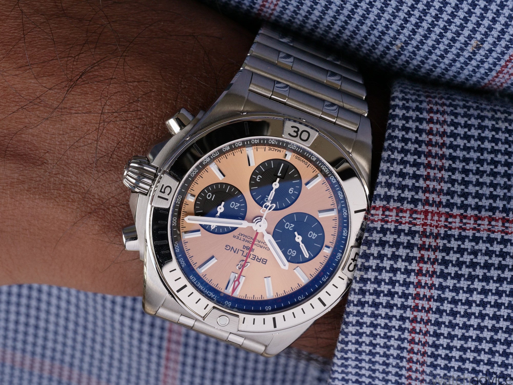 Available in a variety of materials including stainless steel and 18k red gold, the Chronomat features a 42 mm case and the iconic bezel with the four rider tabs. Available with a range of black, blue, silver, and copper dials, the Chronomat is matched to the signature “Rouleaux” bracelet and is powered by the in-house Breitling Manufacture Caliber 01, a COSC-certified chronometer.