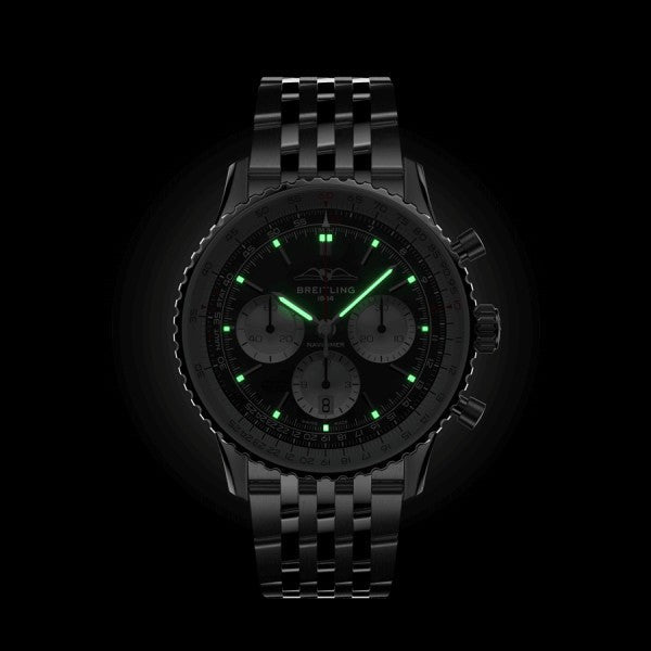 This Navitimer timepiece features a 43mm stainless steel case with a notched bezel for easy grip.