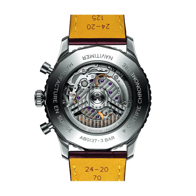 Breitling in house caliber B01 beats at 28,800 vph, contains 47 jewels & has an approximate power reserve of 70 hours.