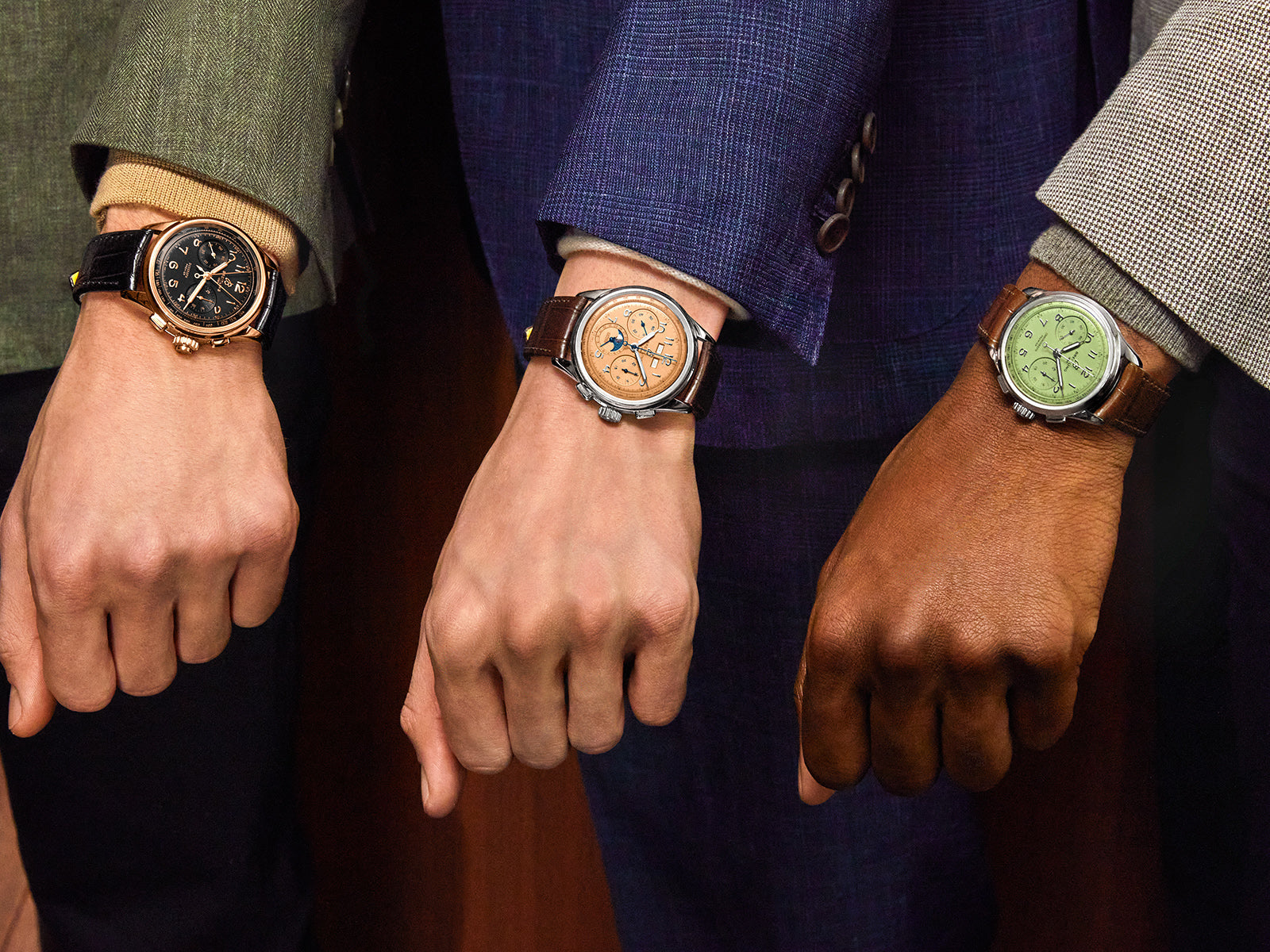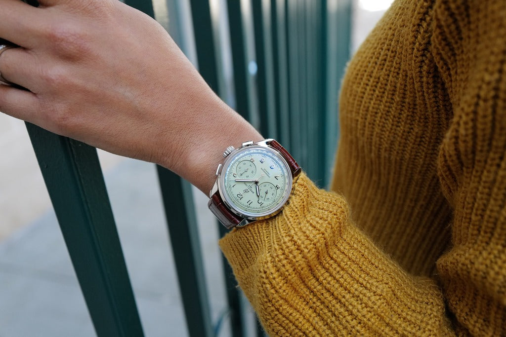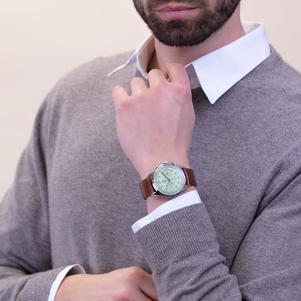 Featuring rectangular chronograph pushers, bi-compax chronograph look and Arabic numerals, the heritage-revived Premier chronographs display a variety of elegant design details such as grooves on the case-sides, open sapphire casebacks and vintage-inspired hands. The Chronograph comes in two variations: in stainless steel with a pistachio green dial and a gold brown alligator strap or in 18k red gold with a silver dial and a brown alligator strap. The Chronograph is powered by the manually wound cosc-certified Breitling Manufacture Caliber B09.