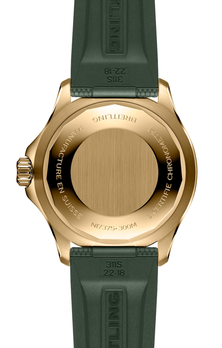 In the 1960s, Breitling designed a timepiece, the Slow Motion, specifically to meet the needs of scuba divers, creating a watch with clean lines, luminescent indexes, squared-off hands, and a high-contrast dial ring for maximum legibility in order to meet the divers' critical timing demands. The Breitling Superocean 42mm Green Dial Bronze Automatic Gents Watch N17375201L1S1 brings performance and style to all water-based activities.