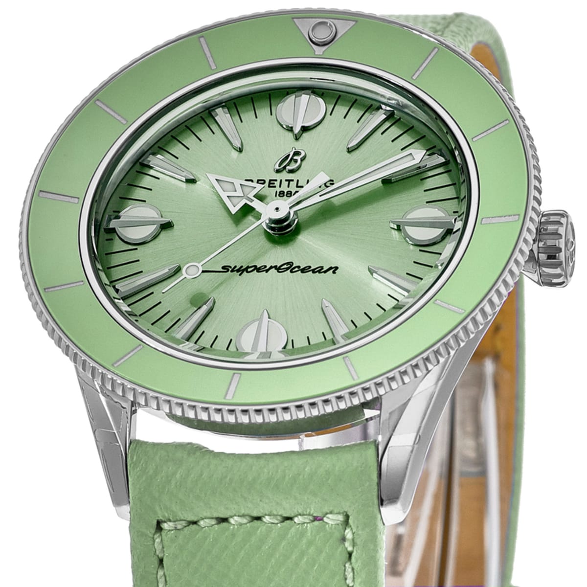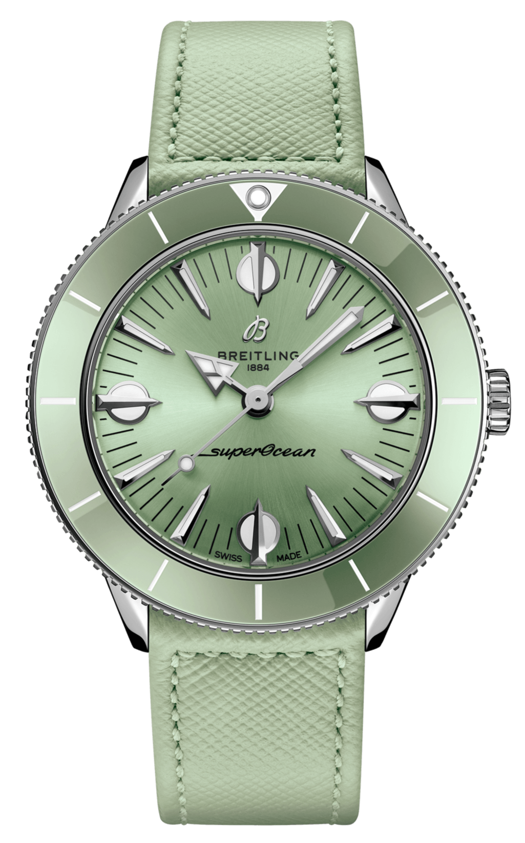 Available in a tempting range of summer shades, the Superocean Heritage ’57 Pastel Paradise Capsule Collection is all about color, proportion and of course substance. It features a 38mm stainless steel case with matching tone-on-tone dials, ceramic bezels and Saffiano calfskin straps. Those who want a custom color combination will love the quick-exchange system for swapping out the straps, which also come in additional colors. The Superocean Heritage ’57 Pastel Paradise is powered by the Breitling Caliber 10, a COSC-certified chronometer.