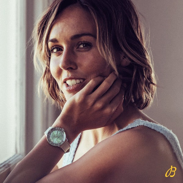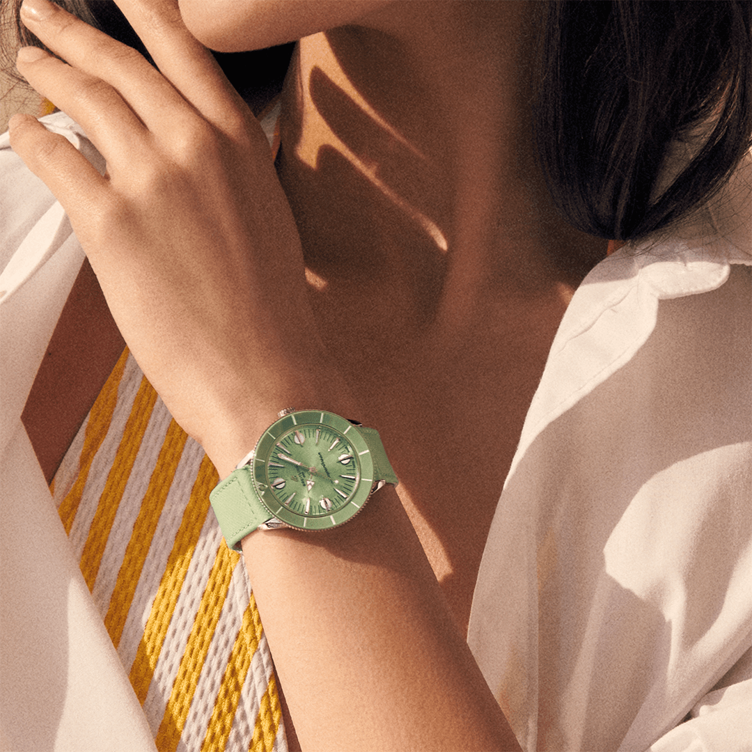 The Superocean Heritage ’57 Pastel Paradise Capsule Collection reuses several design elements from the original 1957 SuperOcean such as the concave ceramic bezel, oversized indexes and arrow-shaped hour hand. But what started as a neat 1950s divers’ watch has evolved into a sleek and fresh watch with a bit of sass and a lot of versatility. Think playsuits, pink flamingos, and headbands setting off perfectly flipped hair. Imagine a carefree and confident lady enjoying a seaside resort, sporting big sunglasses and swinging a straw handbag.