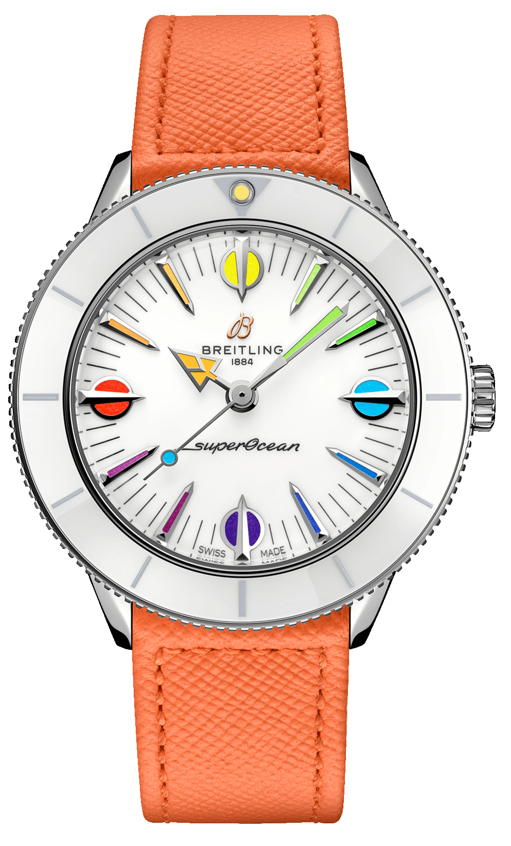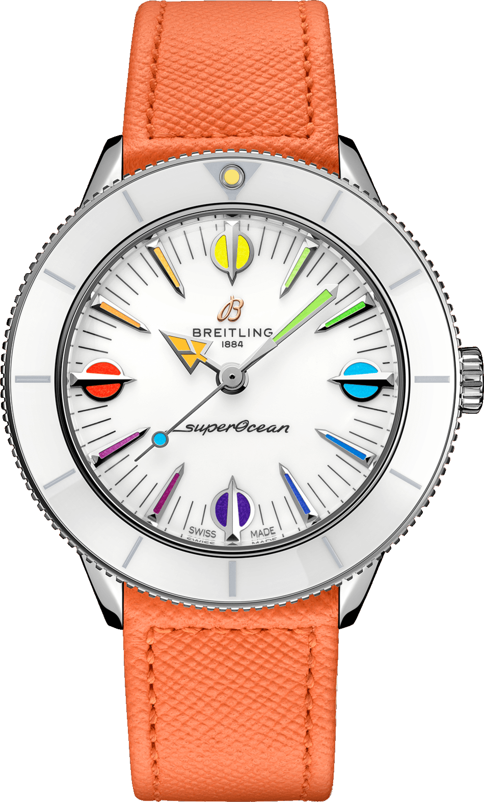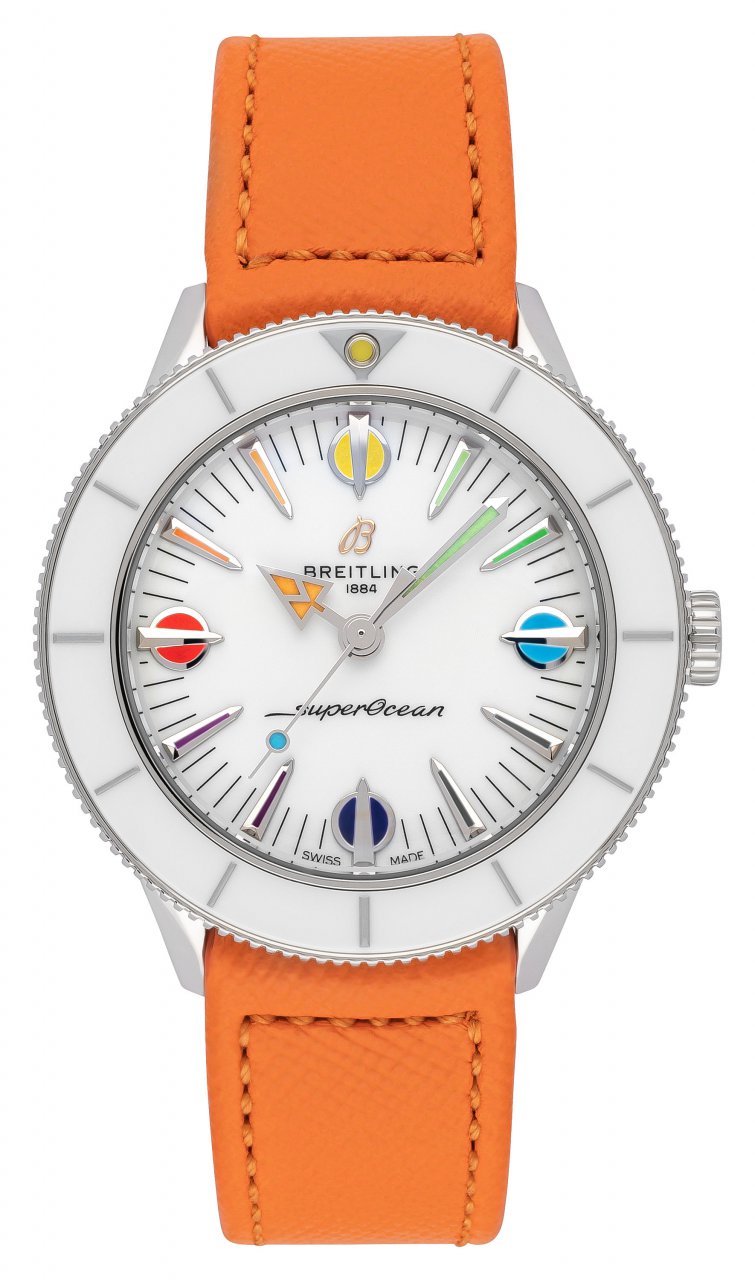 Breitling Superocean Heritage 57 Pastel Paradise Steel White 38 mm watch. Model reference: A10340A11A1X1. Steel case. White ceramic bezel. White dial. Automatic movement. Tangerine leather strap with steel folding clasp. Swiss made. Watch comes in original packaging, with set of documents and 2 years warranty.