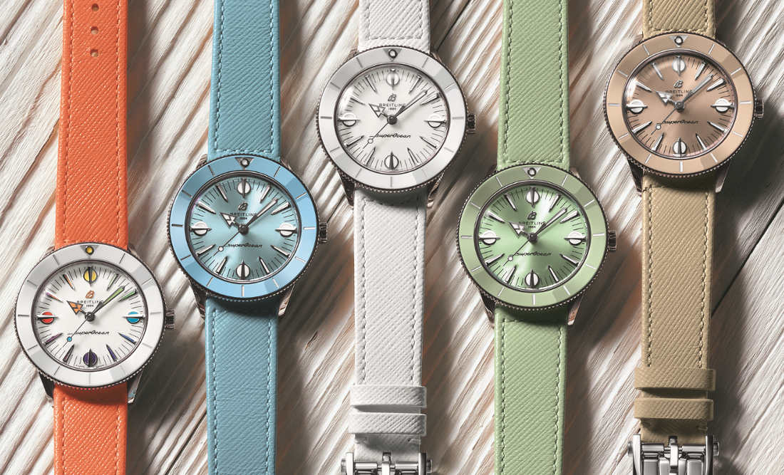 Available in a tempting range of summer shades, the Superocean Heritage ’57 Pastel Paradise Capsule Collection is all about color, proportion and of course substance. It features a 38mm stainless steel case with matching tone-on-tone dials, ceramic bezels and Saffiano calfskin straps. Those who want a custom color combination will love the quick-exchange system for swapping out the straps, which also come in additional colors. The Superocean Heritage ’57 Pastel Paradise is powered by the Breitling Caliber 10, a COSC-certified chronometer.