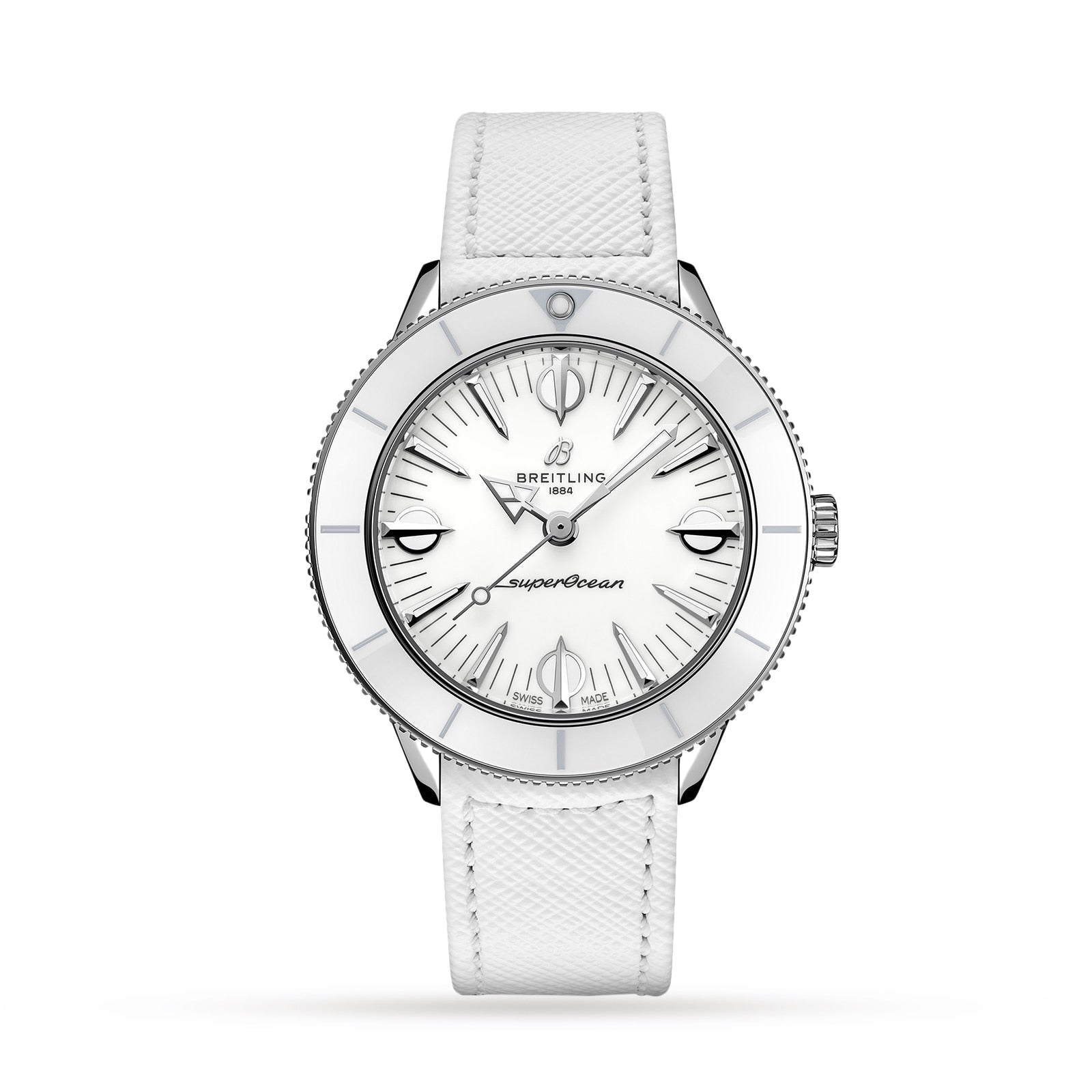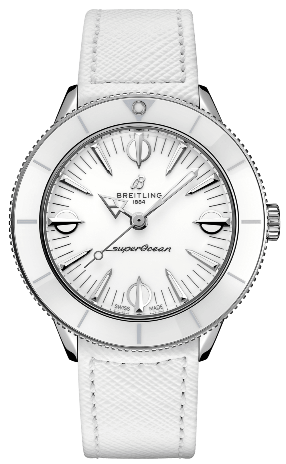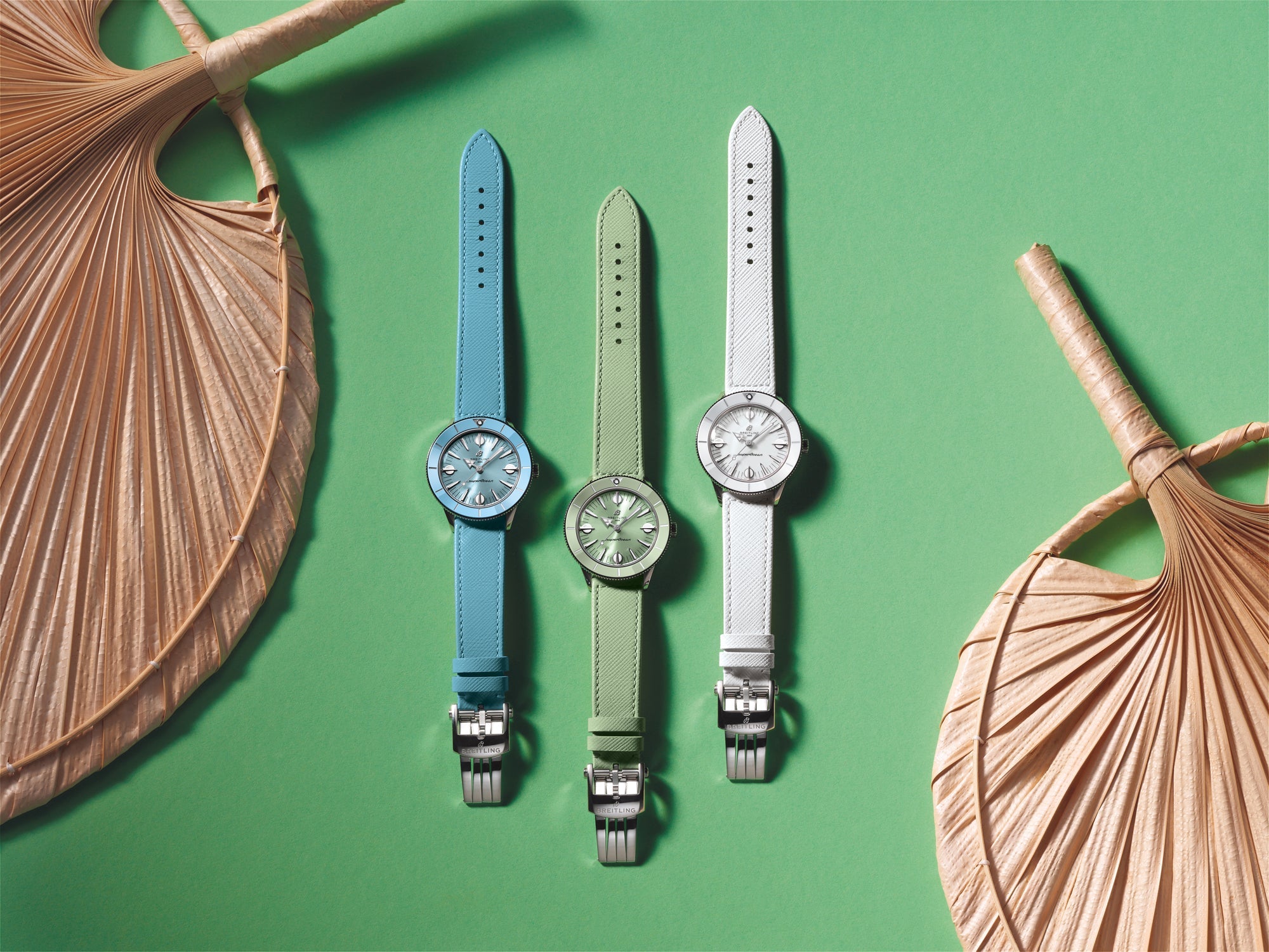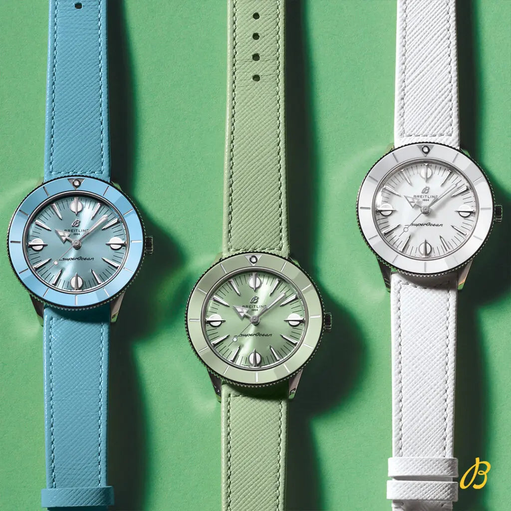 Think playsuits, pink flamingos, and headbands setting off perfectly flipped hair. Imagine a carefree and confident lady enjoying a seaside resort, sporting big sunglasses and swinging a straw handbag. Available in a tempting range of summer shades, the Superocean Heritage ’57 Pastel Paradise Capsule Collection is all about color, proportion and of course substance. It features a 38mm stainless steel case with matching tone-on-tone dials, ceramic bezels and Saffiano calfskin straps. Those who want a custom color combination will love the quick-exchange system for swapping out the straps, which also come in additional colors. The Superocean Heritage ’57 Pastel Paradise is powered by the Breitling Caliber 10, a COSC-certified chronometer.