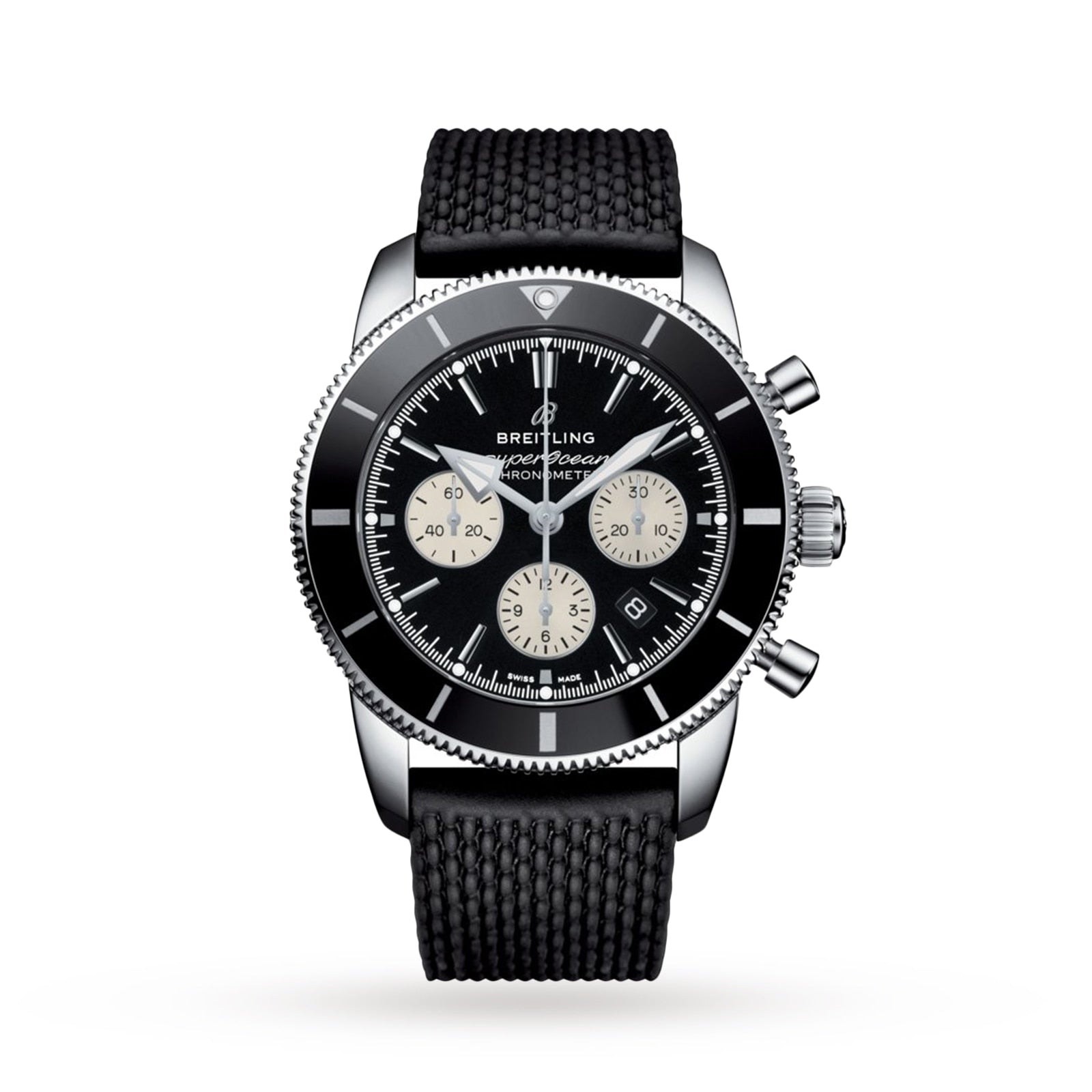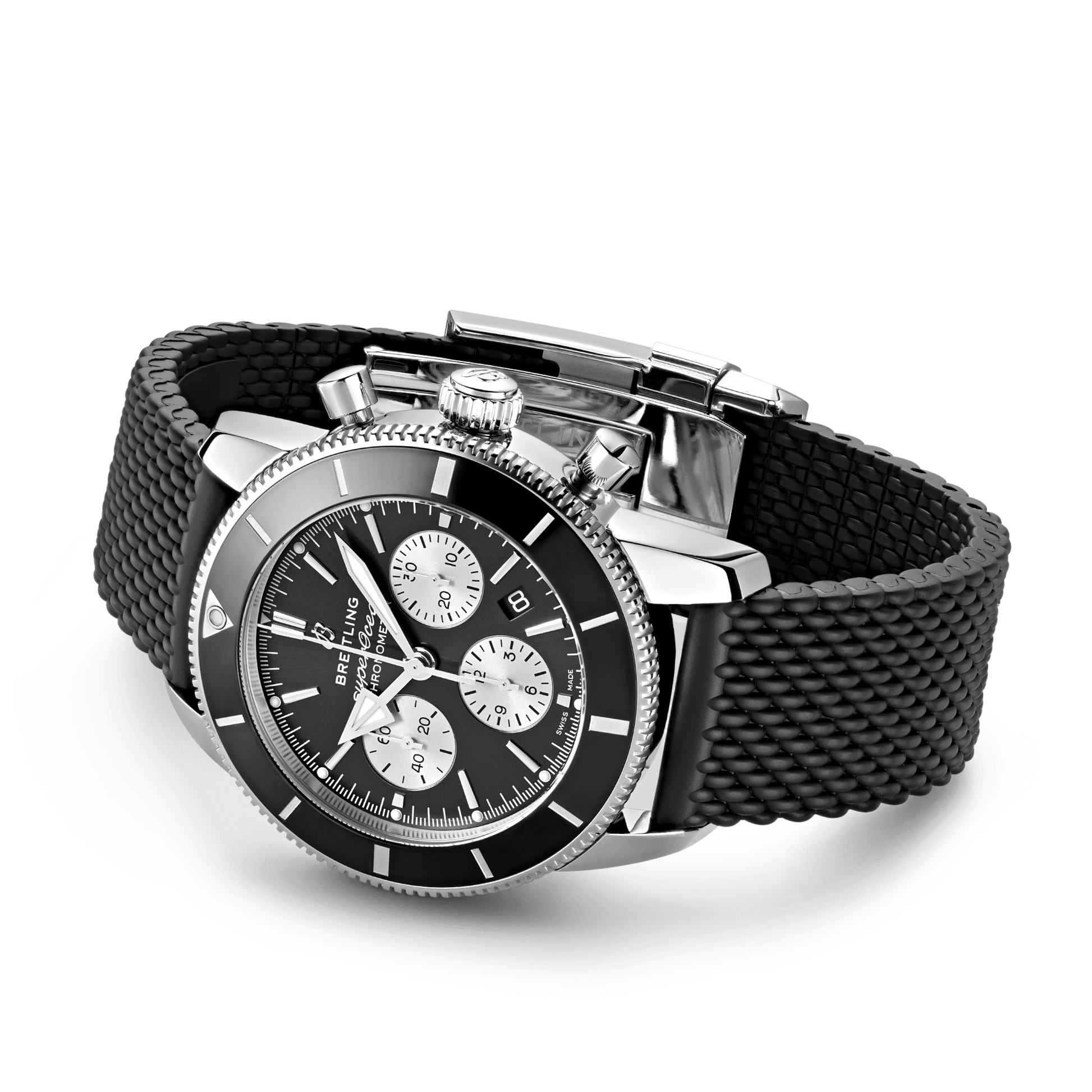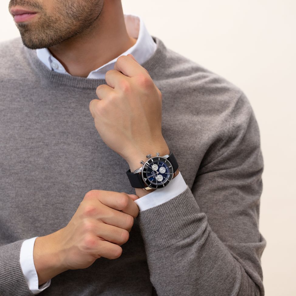 Available in a variety of materials including stainless steel and 18k red gold, the Superocean Heritage B01 Chronograph 44 features a range of black, blue, silver, or green dials. Offered either with a matching mesh bracelet, or a “mesh-styled” rubber strap fitting a folding buckle, this Superocean Heritage is powered by the in-house Breitling Manufacture Caliber 01, a COSC-certified chronometer.
