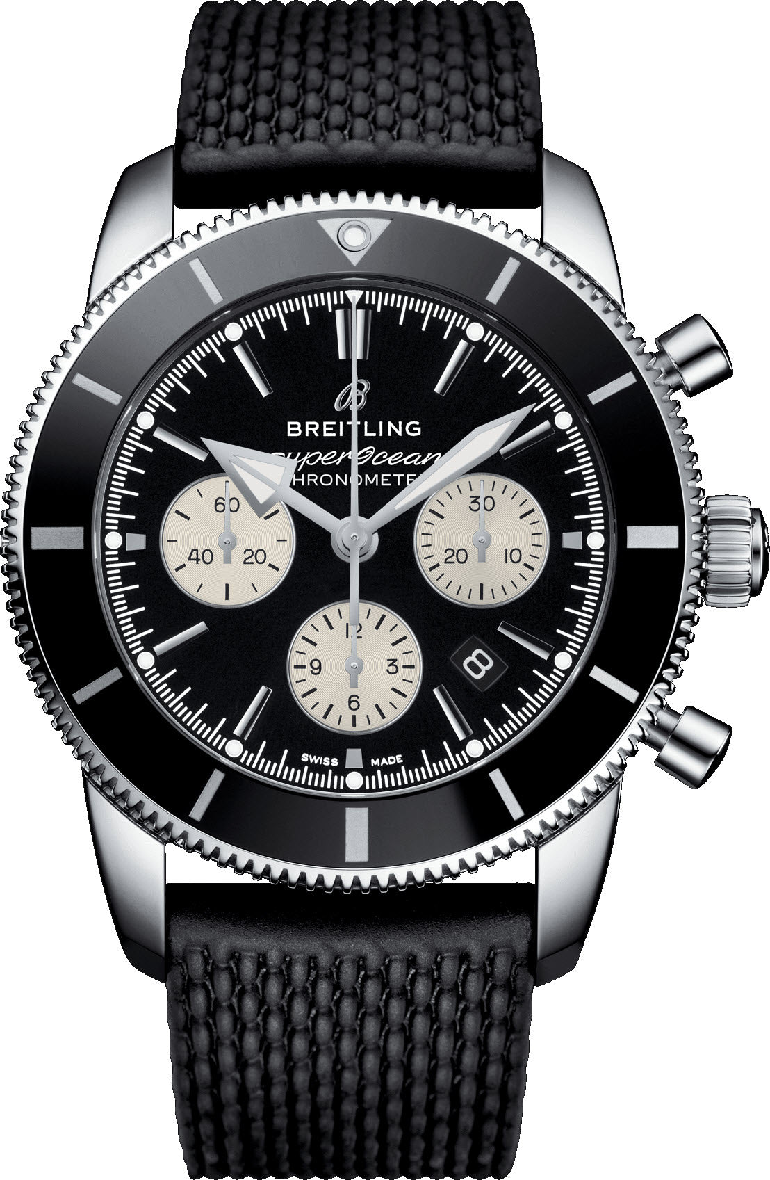 - Black dial with silver subdials