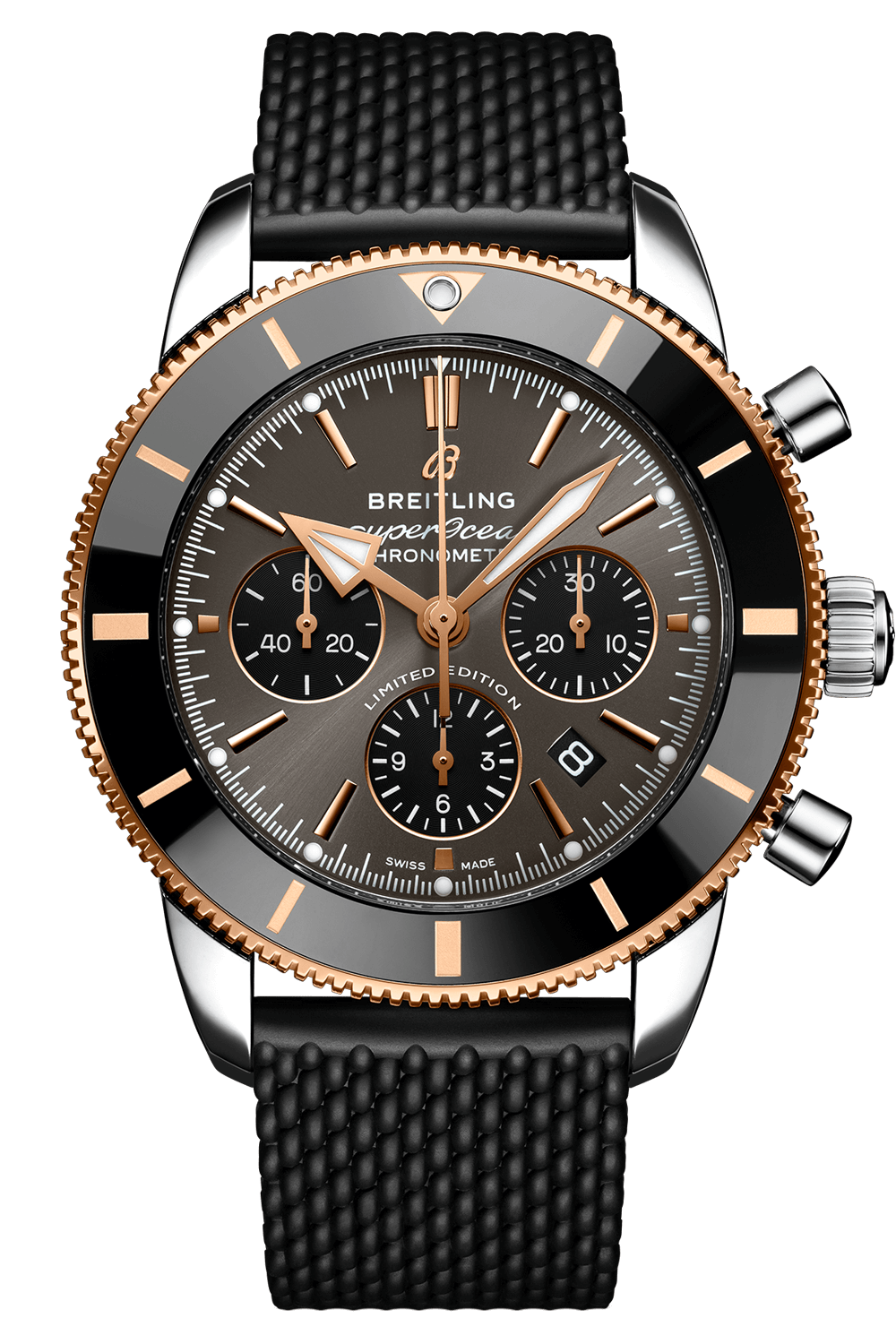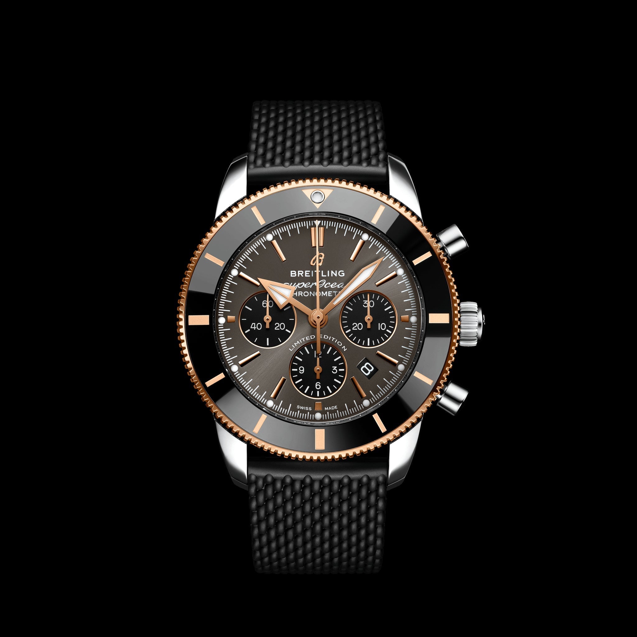 Featuring the iconic triangular-shaped hands as well as a unidirectional bezel with a polished ceramic ring, the Superocean Heritage is an elegant looking diver’s watch. Available here in stainless steel and 18k red gold, this Superocean Heritage B01 Chronograph 44 features a black-eye gray dial. Offered with a “mesh-styled” black rubber strap fitting a folding buckle, this Superocean Heritage is powered by the in-house Breitling Manufacture Caliber 01, a COSC-certified chronometer.