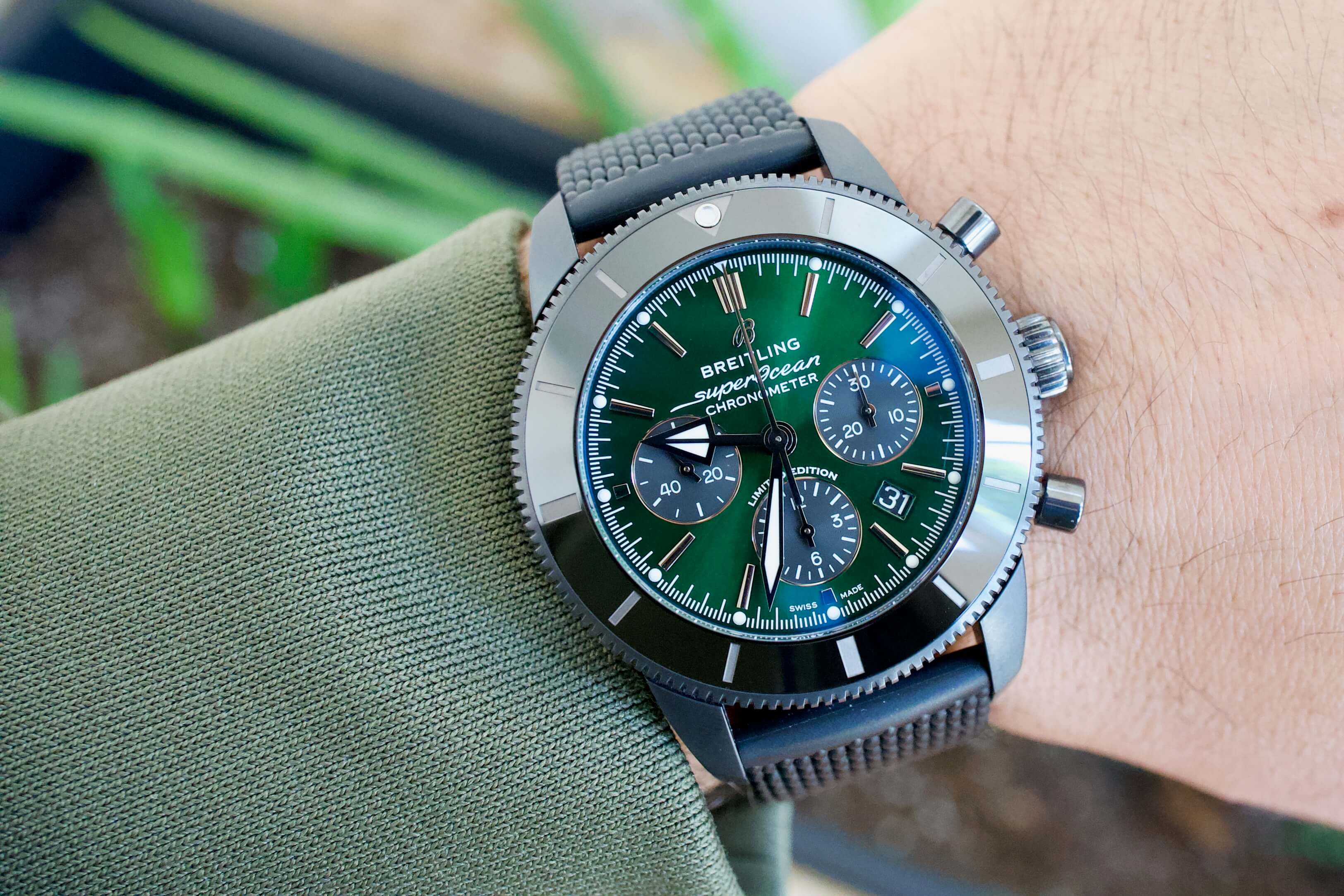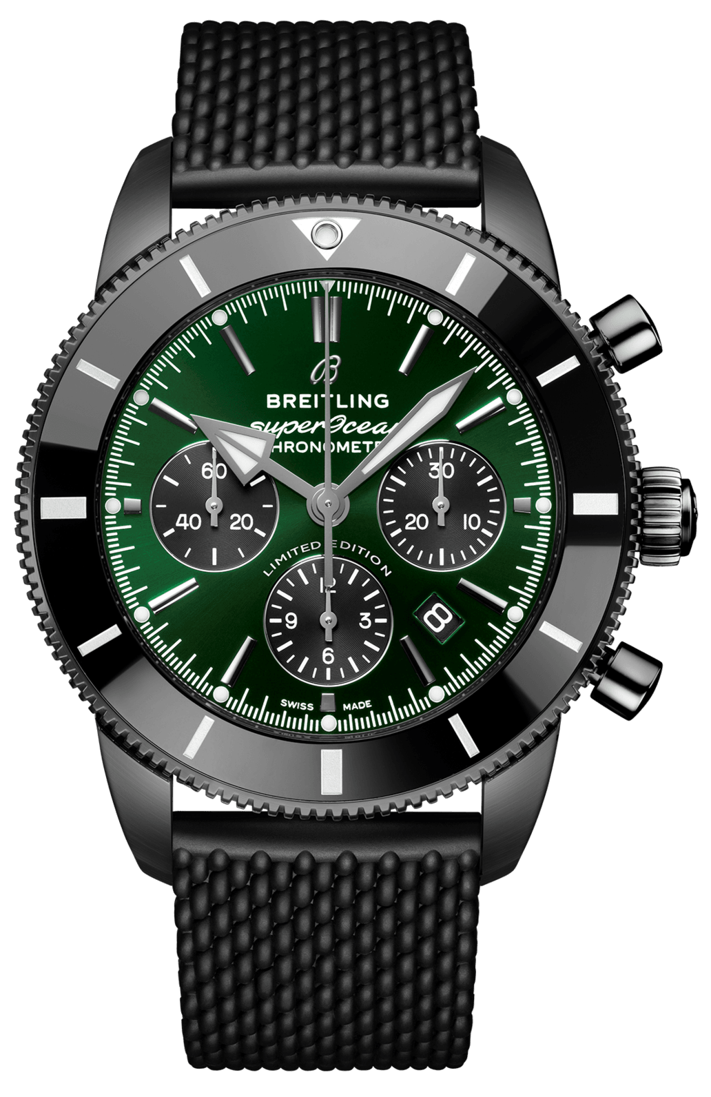 Available here in DLC-coated stainless steel, this Superocean Heritage B01 Chronograph 44 features a black-eye green dial. Offered with a “mesh-styled” black rubber strap fitting a folding buckle, this Superocean Heritage is powered by the in-house Breitling Manufacture Caliber 01, a COSC-certified chronometer.