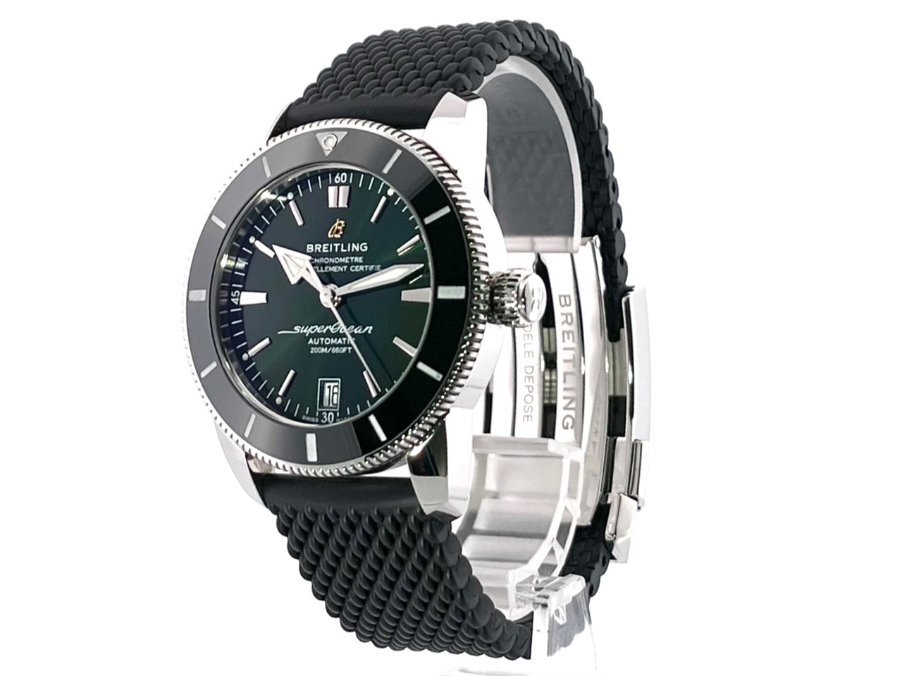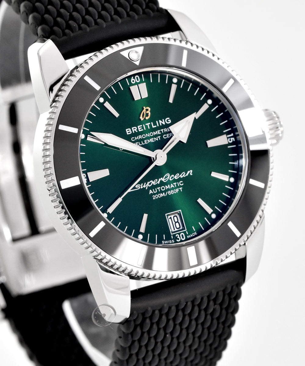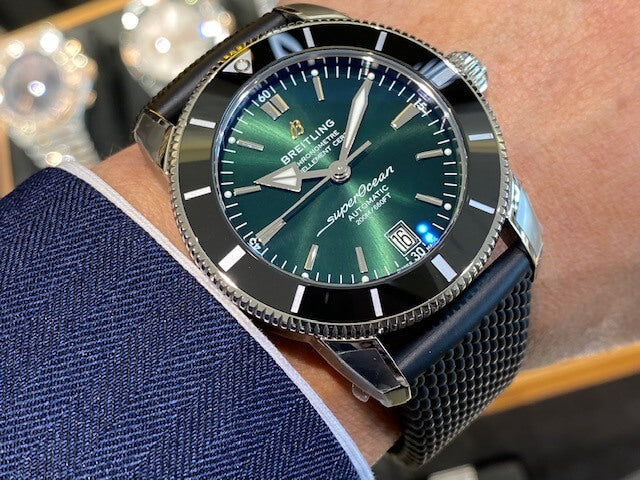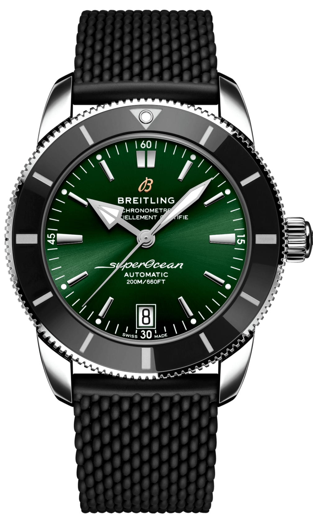 Available in a variety of sizes and materials including stainless steel and 18k red gold, the Superocean Heritage B20 Automatic features a range of black, blue or green dials. Offered either with a matching mesh bracelet, or a “mesh-styled” rubber strap fitting a folding buckle, this Superocean Heritage is powered by the Breitling Manufacture Caliber B20, a COSC-certified chronometer based on the Tudor Caliber MT5612.