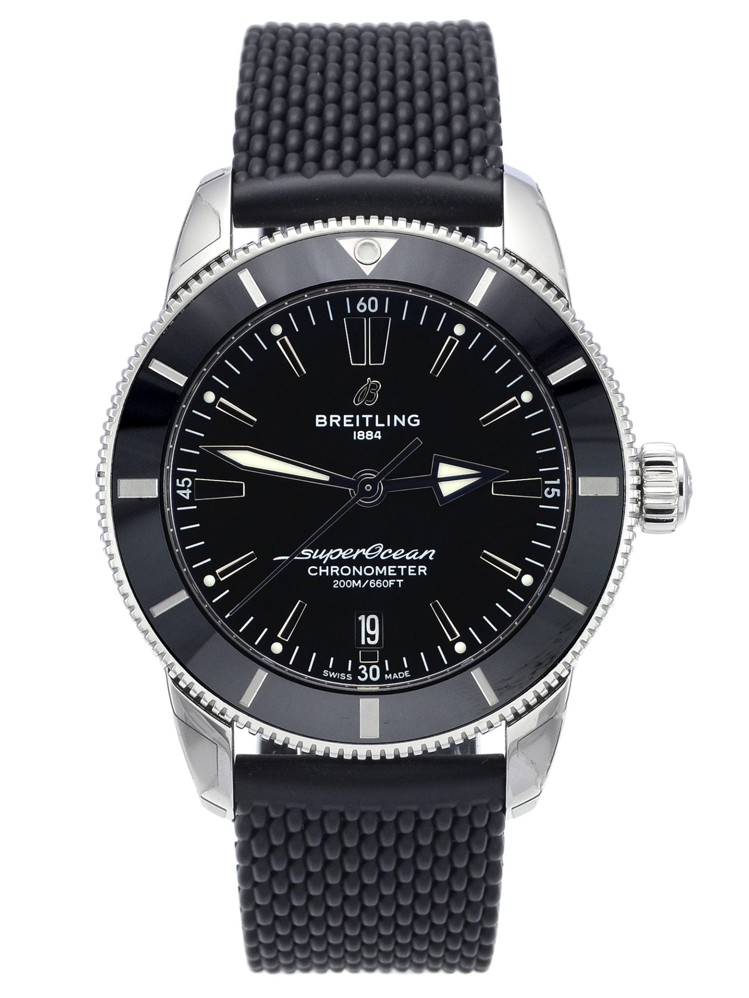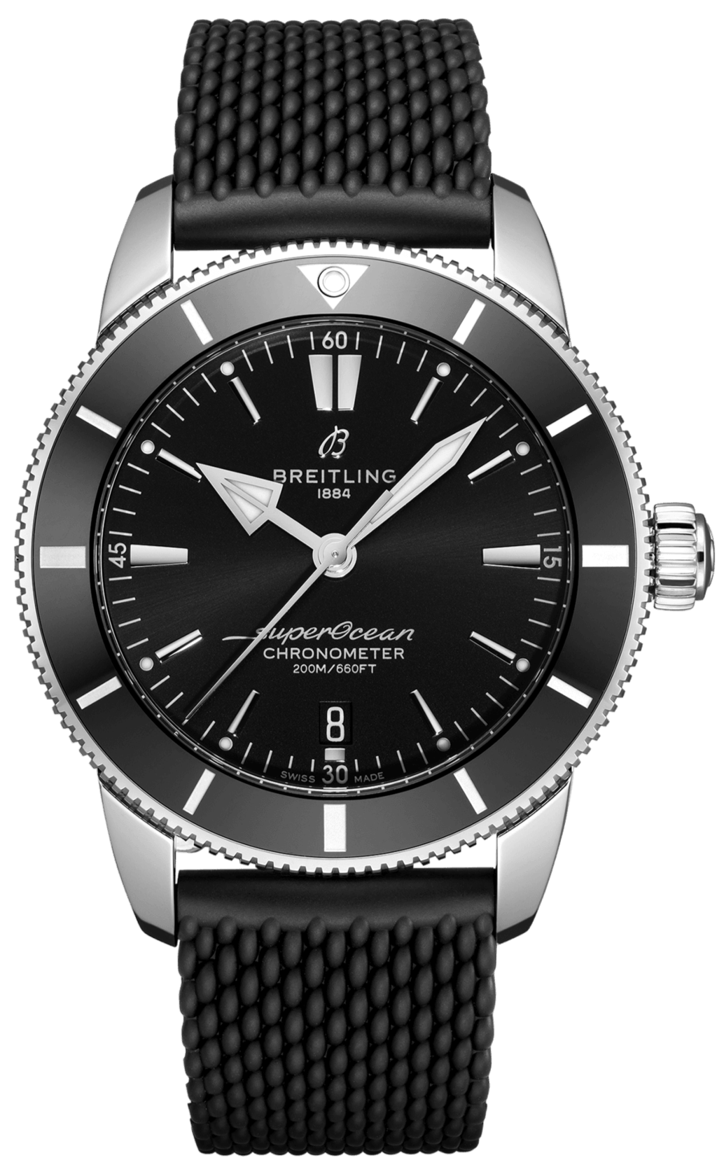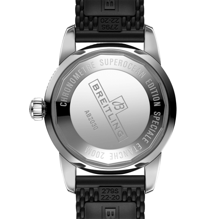 Available in a variety of sizes and materials including stainless steel and 18k red gold, the Superocean Heritage B20 Automatic features a range of black or blue dials. Offered either with a matching mesh bracelet, or a “mesh-styled” rubber strap fitting a folding buckle, this Superocean Heritage is powered by the Breitling Manufacture Caliber B20, a COSC-certified chronometer based on the Tudor Caliber MT5612.