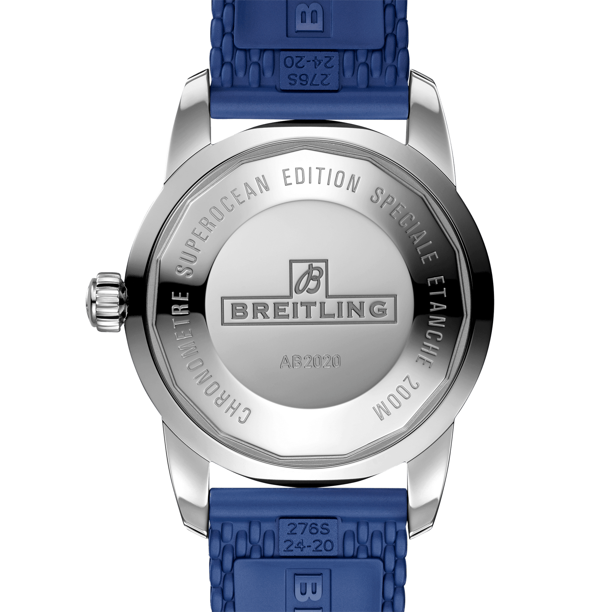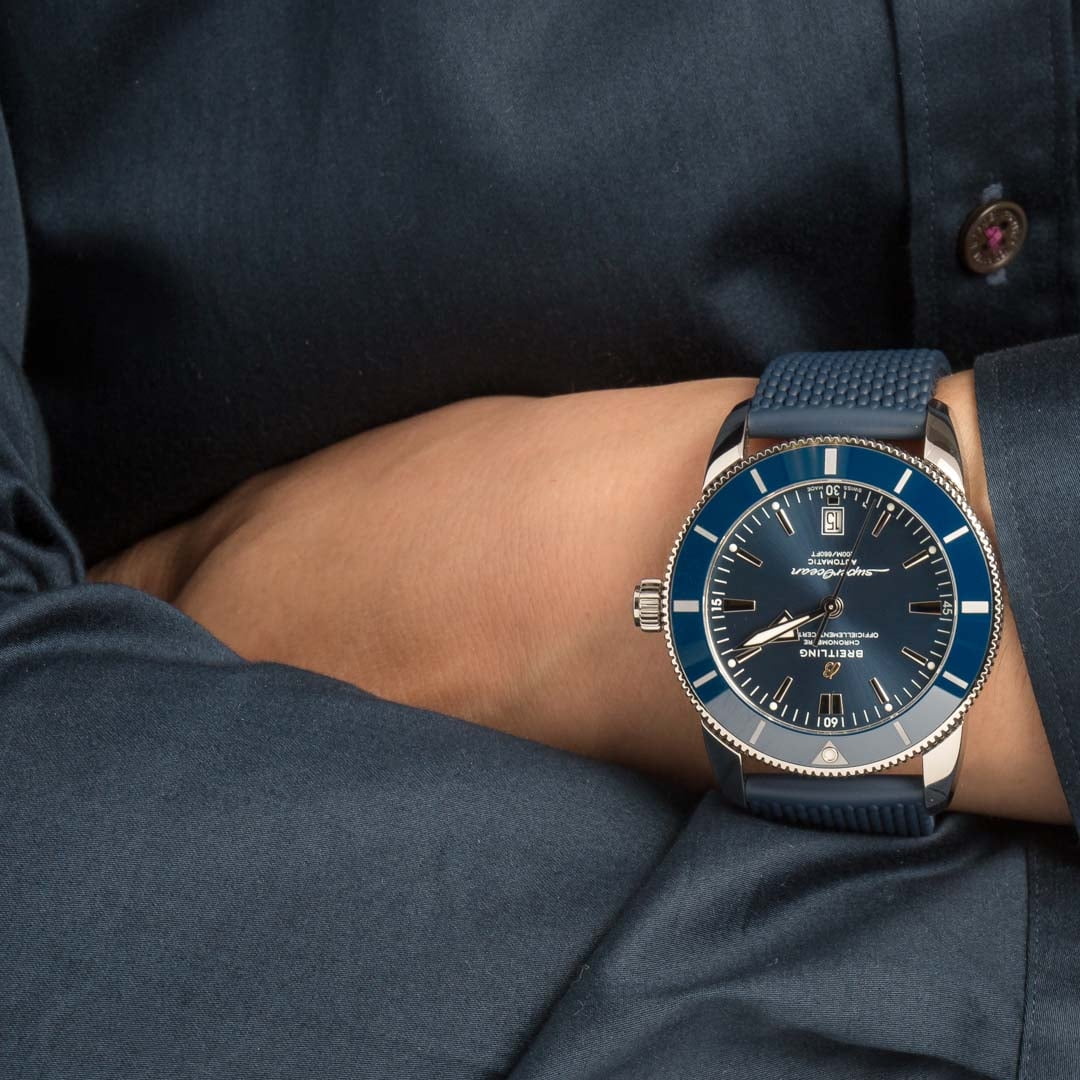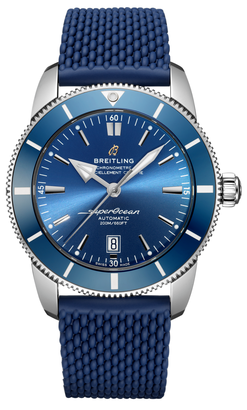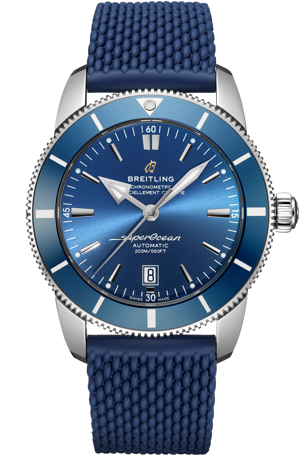 Stainless steel case with a blue (aero classic) rubber strap. Uni-directional rotating stainless steel bezel with a blue ceramic ring. Blue dial with luminous silver-tone hands and index hour markers. Minute markers around the outer rim. Dial Type: Analog. Luminescent hands and markers. Date display at the 6 o'clock position. Breitling calibre 20 automatic movement with a 70-hour power reserve. Scratch resistant sapphire crystal. Screw down crown. Solid case back. Round case shape. Case size: 46 mm. Case thickness: 15 mm. Band width: 24 mm. Fold over clasp with a push button release. Water resistant at 200 meters / 660 feet. Functions: hour, minute, second. Luxury watch style. Watch label: Swiss Made. Item Variations: AB202016-C961-276S-A20D.2. Breitling Superocean Heritage II Automatic Blue Dial Men's Watch AB2020161C1S1.