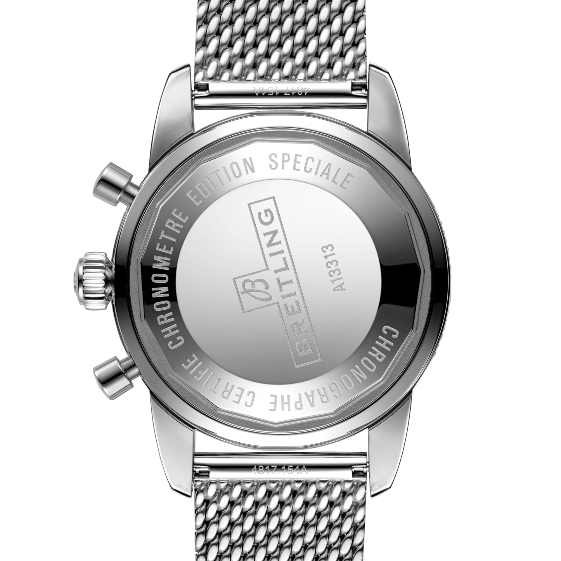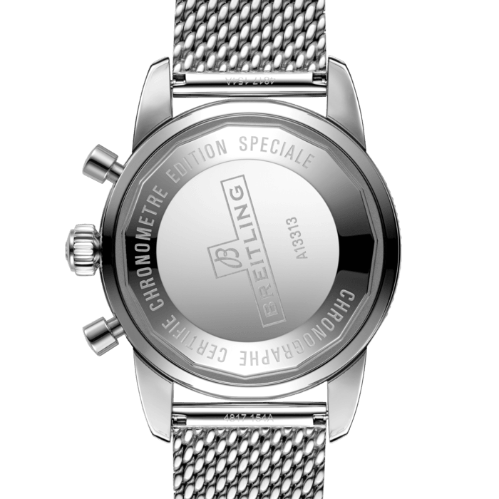 Available in a variety of materials including stainless steel and 18k red gold, the Superocean Heritage Chronograph 44 features a range of colored dials. Offered either with a matching mesh bracelet, or a “mesh-styled” rubber strap fitting a folding buckle, this Superocean Heritage is powered by the Breitling Caliber 13, a COSC-certified chronometer.