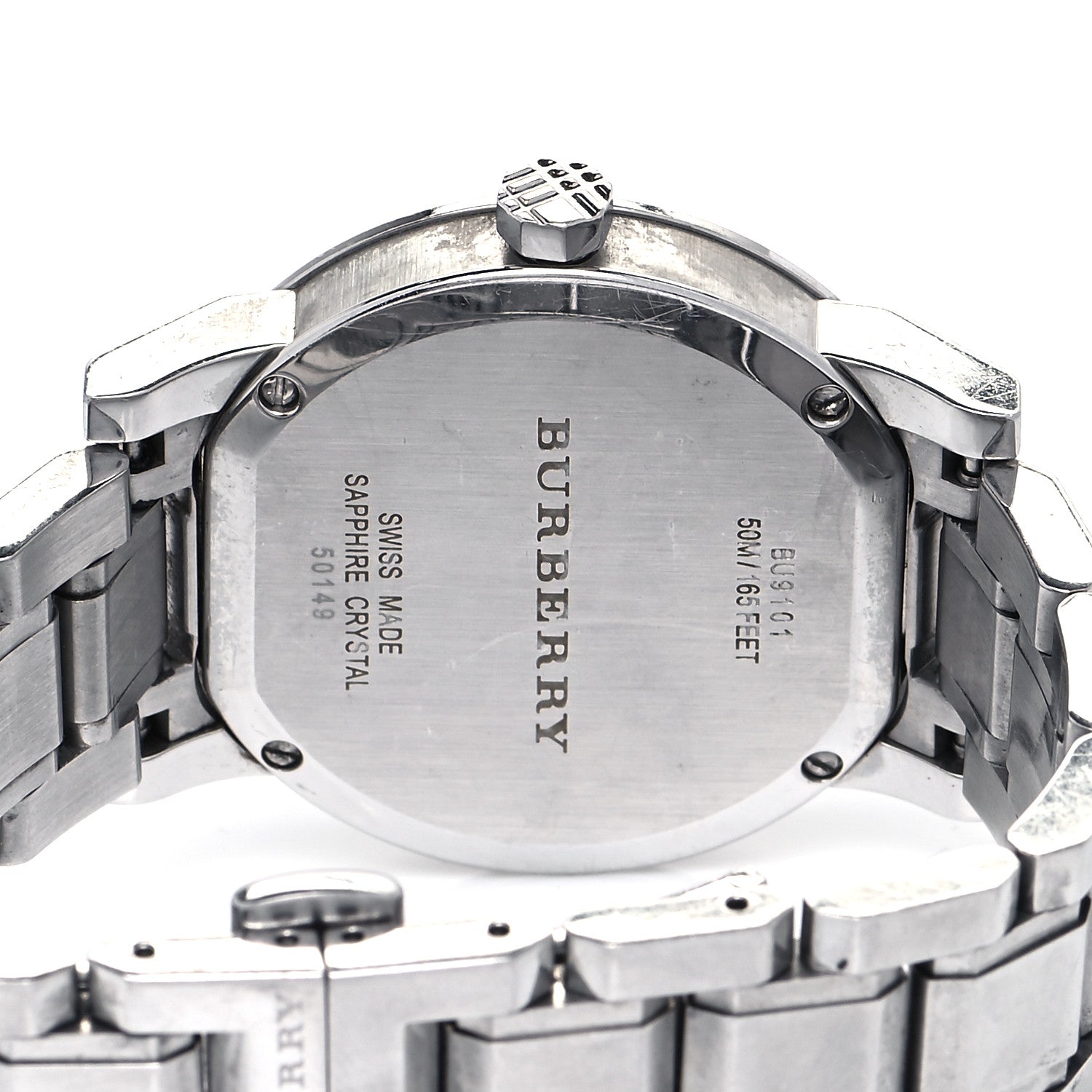 Pull / push crown. Solid case back. Case diameter: 34 mm. Case thickness: 8 mm. Round case shape. Band width: 16 mm. Deployment clasp. Water resistant at 50 meters / 165 feet. Functions: date, hour, minute, second. Casual watch style. Watch label: Swiss Made. Burberry Black Check Stamped Dial Stainless Steel Ladies Watch BU9101.