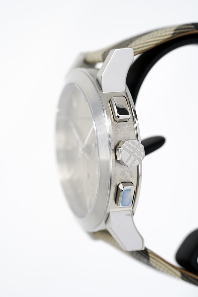 Burberry Quartz Chronograph # BU9358. Band Color: Beige. Case Material: Stainless Steel. Dial Color: Silver. Clasp Type: Buckle. Display Type: Chronograph. Bezel Material: Stainless Steel. Item Shape: Round. Bezel Function: Stationary. Band Material: Cloth. Crystal: Anti-Reflective Sapphire.