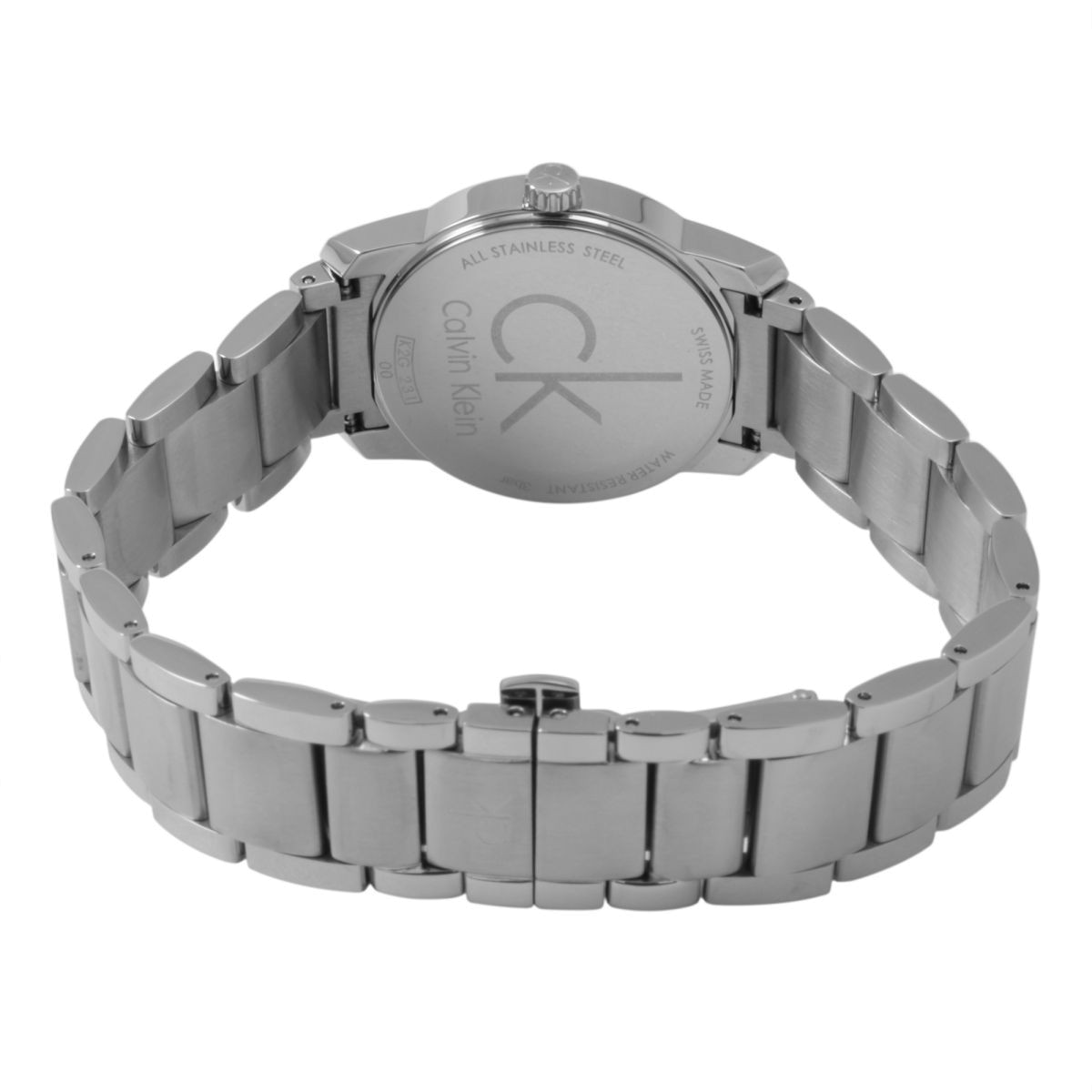 Classic ladies Calvin Klein City watch in stainless steel, set around a silver dial with baton hour markers.