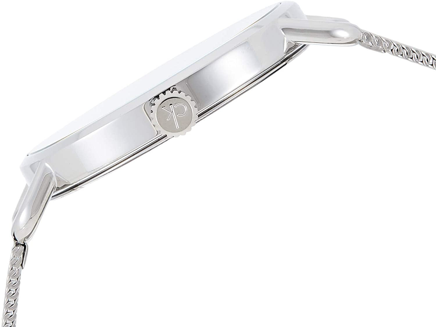 Stainless steel case with a stainless steel mesh bracelet. Fixed stainless steel bezel. Black dial with luminous silver-tone hands and index hour markers. Dial Type: Analog. Luminescent hands. Quartz movement. Scratch resistant mineral crystal. Pull / push crown. Solid case back. Round case shape. Case size: 42 mm. Case thickness: 9 mm. Band width: 18 mm. Fold over slip through clasp. Water resistant at 30 meters / 100 feet. Functions: hour, minute. Even Series. Casual watch style. Watch label: Swiss Made. Calvin Klein Even Quartz Black Dial Ladies Watch K7B21121.