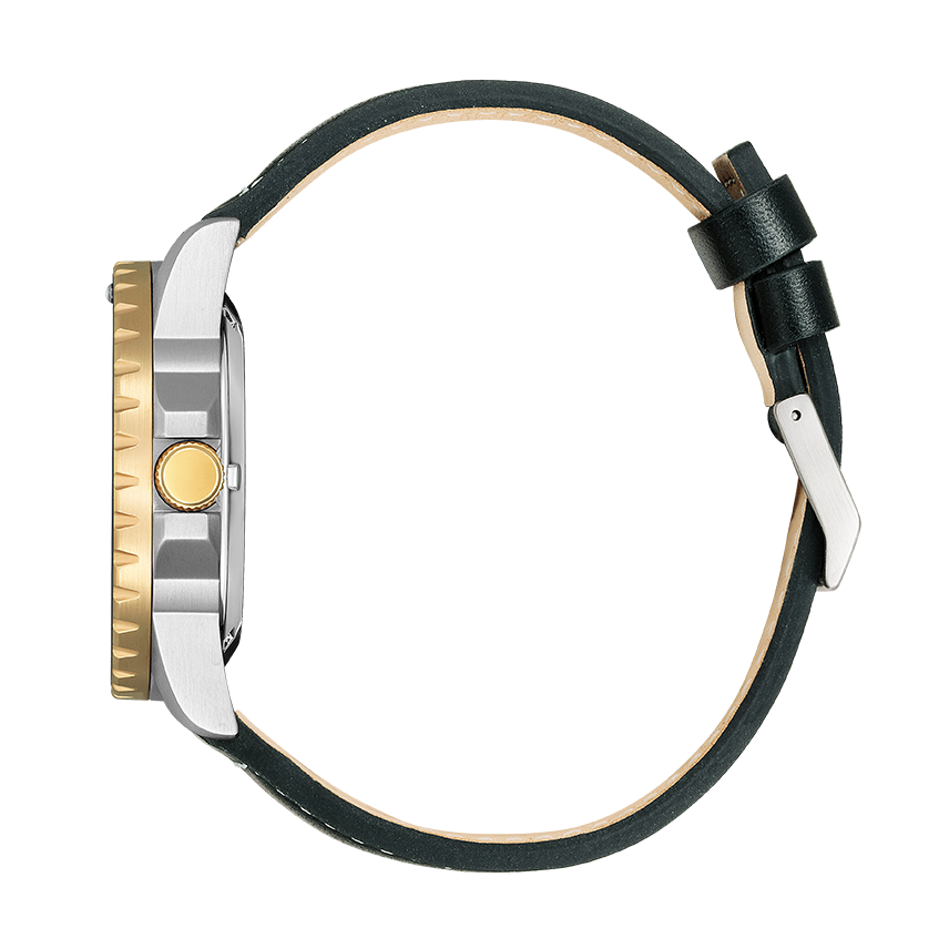 Soar to new heights with this modernized timepiece from Citizen Mechanical Collection. Its modern and contemporary design reflects great craftsmanship and enduring quality. Its sleek rich black dial, Date, stainless steel case and leather strap complement its pure and appealing aesthetic.