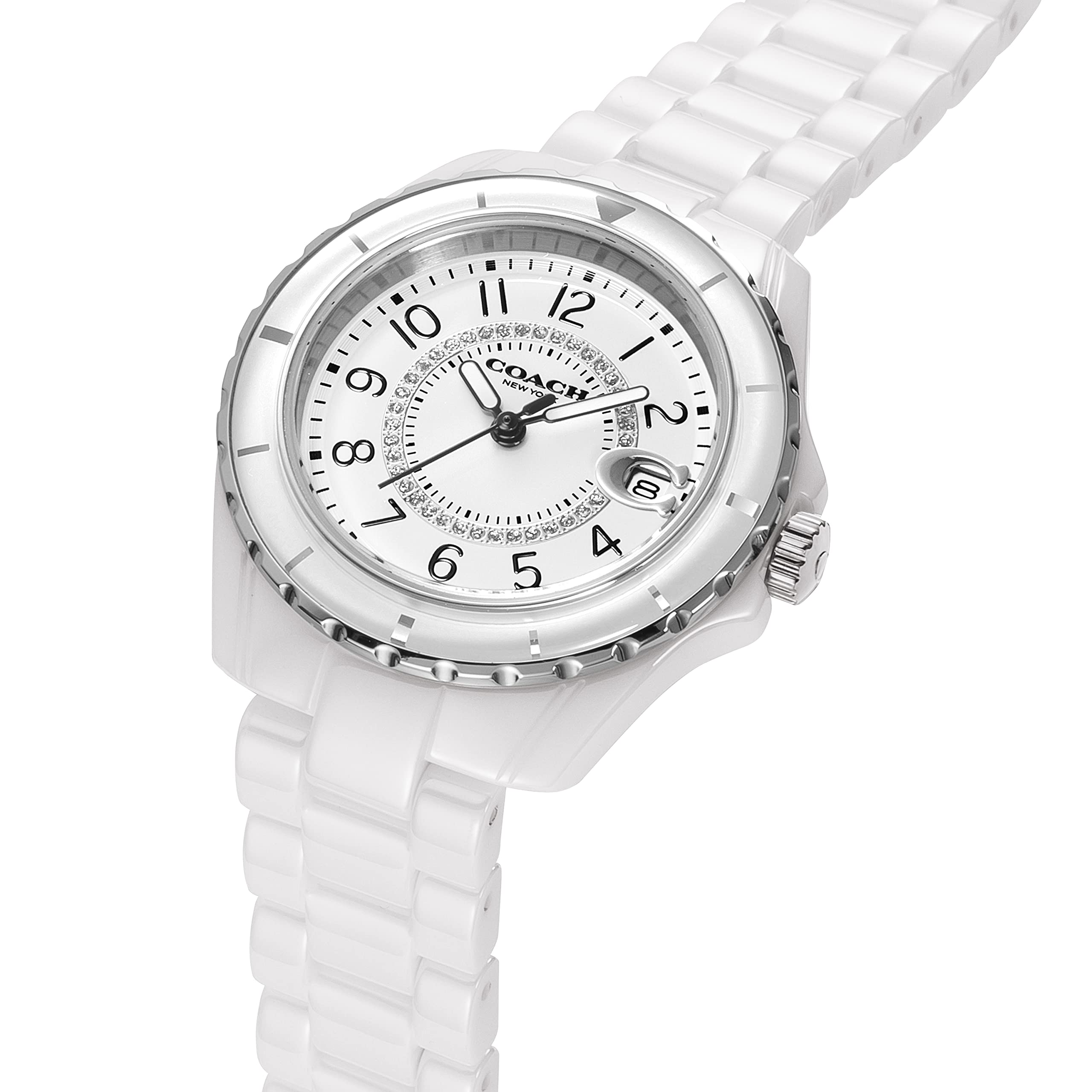Undeniably eye-catching, this Preston women's watch from Coach is a chic timepiece adding distinction to any look. A bold 32mm white ceramic caseback is adorned with gold accents while the white dial features silver-tone concentric rings culminating in a row of ornate Swarovski® crystals. Features include a date display, luminescent hands and water resistance to 30 meters. The white ceramic bracelet secures with a push-button deployment clasp.