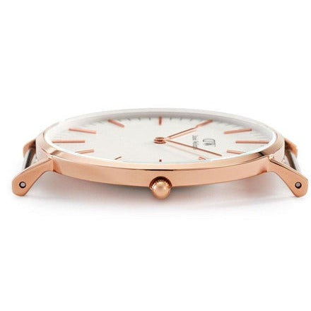 The Daniel Wellington DW00100257 watch has a unique design that is suitable for both girls and men and will go perfectly with a dress or suit. An excellent combination of a white dial with a black strap and a gold case, the minimalist design of the dial does not distract attention, focusing all attention on the time. The case is round in shape with a diameter of 40 mm, made of stainless steel with pink PVD coating.