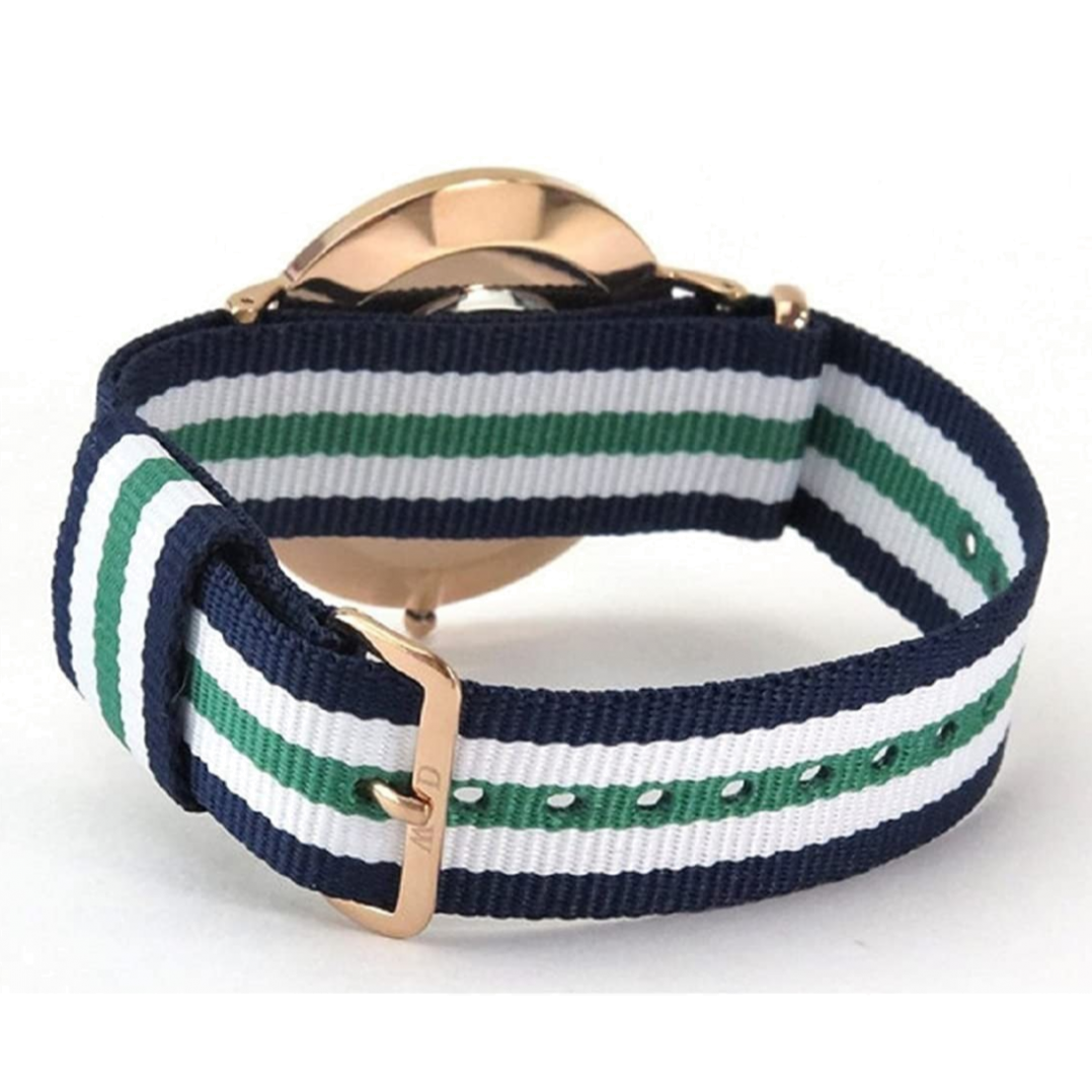 The original Daniel Wellington men's watch 0108DW, from the Nottingham collection, is part of the Casual watch category. The clock mechanism is a quartz one, housed in a round case with an opaque cover. The diameter of the case is 40 mm, and the thickness is 6 mm. The Daniel Wellington 0108DW watch has a nato (nylon) strap and an analog dial, covered by a mineral crystal glass. Water resistant to a depth of 30 m (3 atm), the watch has the following functions: hour, minute.