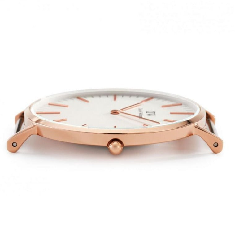 Round case shape. Case size: 40 mm. Case thickness: 6 mm. Band width: 20 mm. Band length: 8 inches. Tang clasp. Water resistant at 30 meters / 100 feet. Functions: hour, minute. Casual watch style. Watch label: Japan Movt. Item Variations: DW00100007. Daniel Wellington Classic Sheffield White Dial Men’s Watch 0107DW.