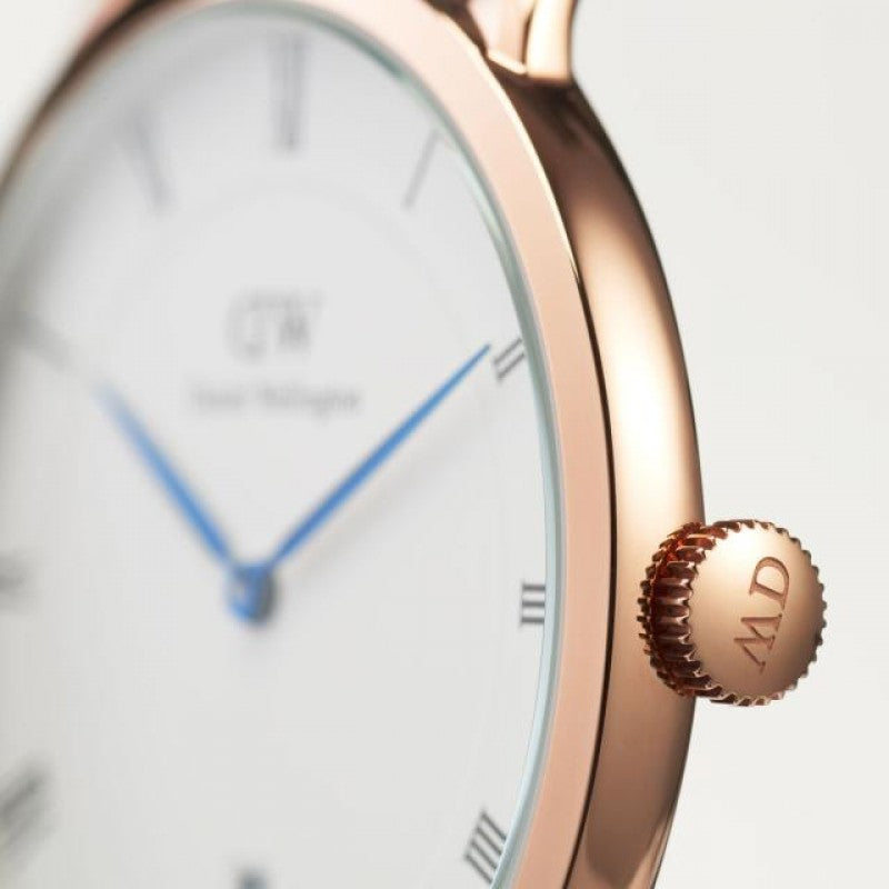 Daniel Wellington Watch Dapper 38 St Mawes DW00100083. Elegant and polished, the Dapper St Mawes is an unpretentious watch that starts your day at the office and ends it at a cocktail party. The beautiful St Mawes leather strap has been paired with a slim case in silver or rose gold, which makes it an effortless timepiece for every adventure. With sophisticated details such as deep blue hands, Roman numerals and a date display, the Dapper St Mawes is a great addition to any wardrobe, and goes with all styles and ages.