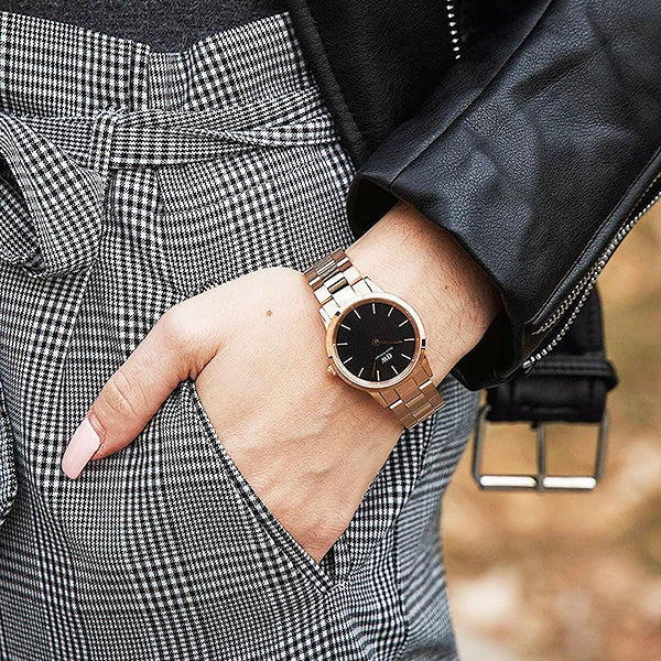 Daniel Wellington ICONIC LINK ROSE GOLD BLACK DW00100212 is a modern watch in a classic style that will certainly complement any style. This watch has a rose gold bracelet and case, perfectly composed with a black dial, decorated with delicate but noteworthy indexes. This watch is water resistant to 3 ATM, which means it is resistant to light splashes. The quartz movement accurately indicates the time, and the mineral glass is scratch and impact resistant.