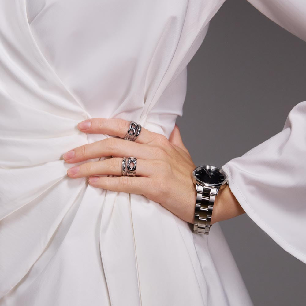 The distinctive, sculptural lines of the raised centerpiece blend seamlessly into the watch case, while our unique dial takes on a fresh, modern silhouette. Iconic Link is available in polished stainless steel (316L) with a vibrant silver finish or refined rose gold plated.