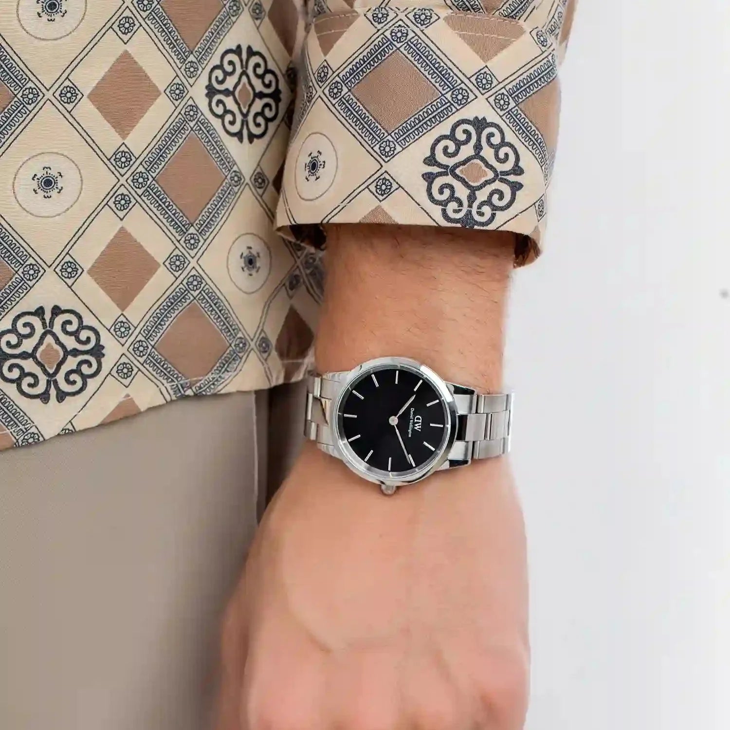 Silver-tone stainless steel case and bracelet. Fixed silver-tone stainless steel bezel. Black dial with silver-tone hands and index hour markers. Dial Type: Analog. Quartz movement. Scratch resistant mineral crystal. Pull / push crown. Solid case back. Round case shape, case size: 36 mm, case thickness: 10 mm. Band width: 14 mm. Butterfly clasp. Water resistant at 30 meters / 100 feet. Functions: hour, minute. Iconic Link Series. Casual watch style. Watch label: Japan Movt. Daniel Wellington Iconic Link Quartz Black Dial Unisex Watch DW00100204.
