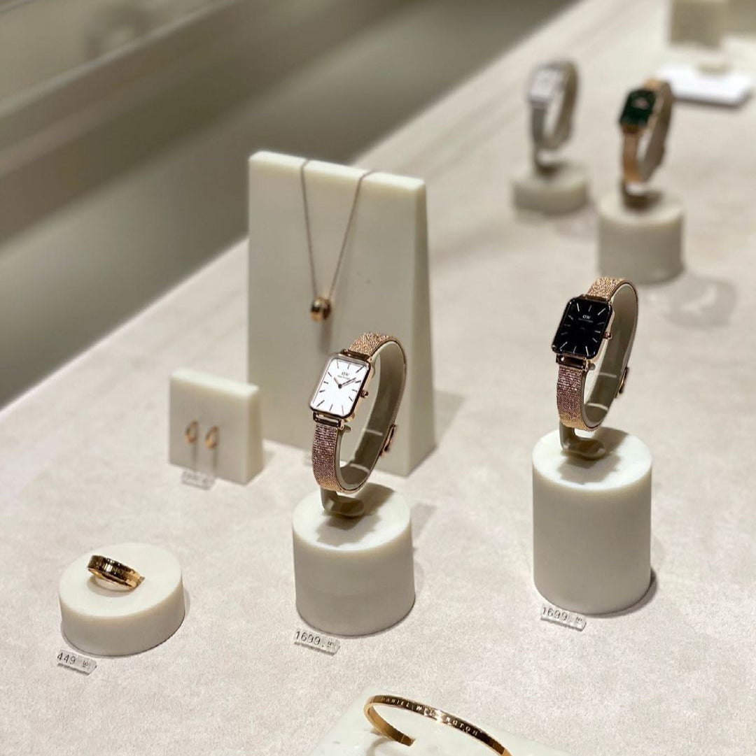 - Rose gold case color, black strap color, and white face color for a striking contrast