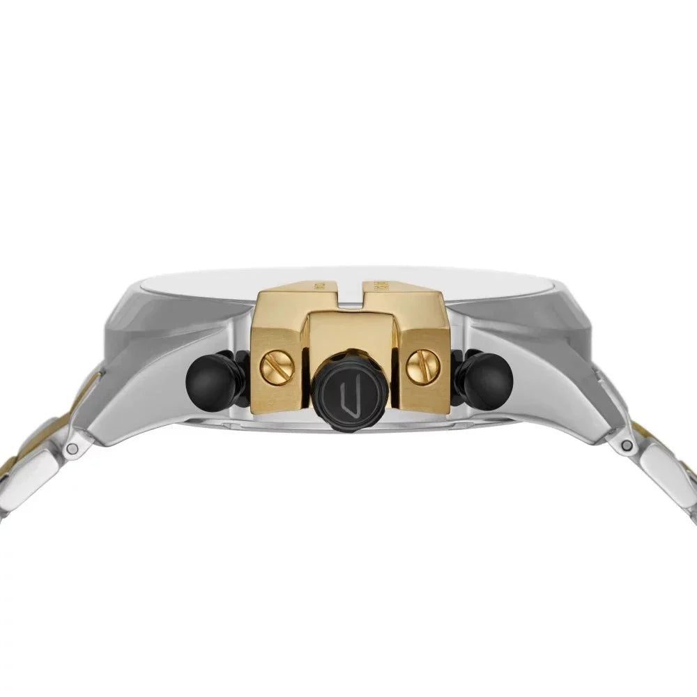The probability of losing such a watch is reduced to a minimum. Case, fluted winding crown Winding crown A part of the watch case, designed for winding the watch and adjusting the time and date. Also present in quartz watches, where winding is not required, for adjusting the time and date, switching modes, and stopping the watch. and the clasp are decorated with the Diesel brand logos.