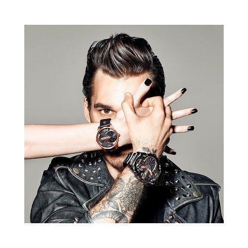 Featuring a black silhouette with black leather straps and rose gold-tone accents, this Mr. Daddy 2.0 watch delivers brazen attitude and style.