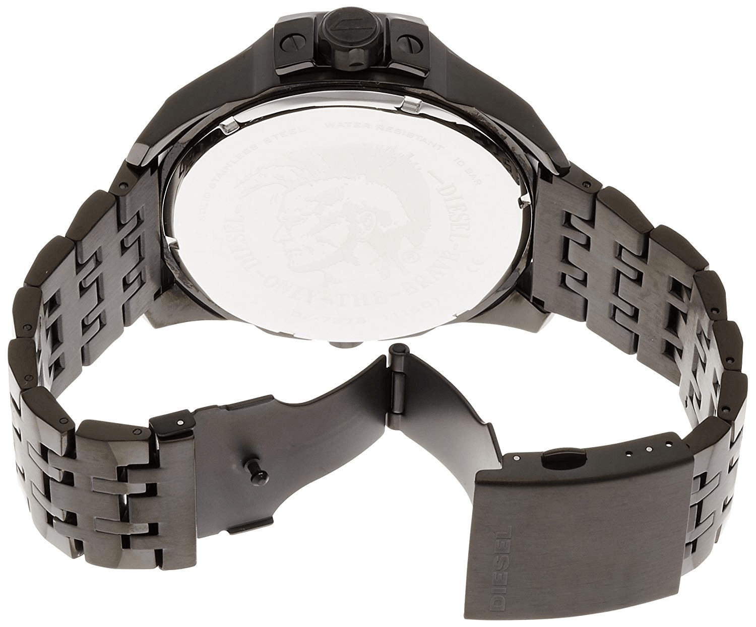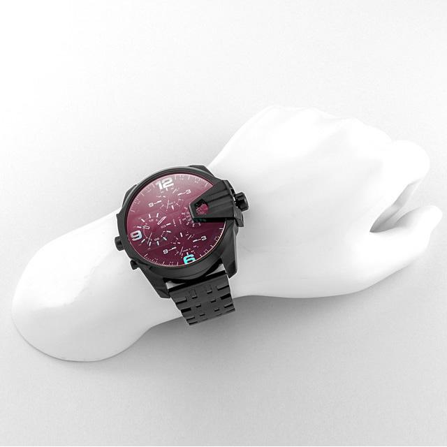 Dominate the field in the black metal Diesel Uber Chief watch. The textured iridescent chronograph dial features applied blue iridescent Arabics with blue tracking accents.