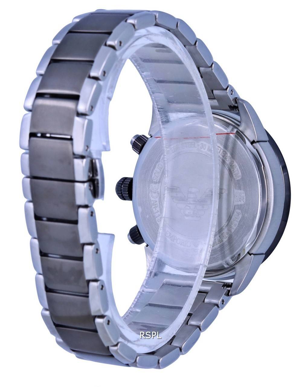 Robust and edgy, this 44mm Watch Set from Emporio Armani is an extravagant yet the most versatile watch-making creation. This timepiece features a gray sunray dial with black and blue stick indexes, chronograph movement, and stainless steel bracelet with gunmetal links. Lend a touch of luxury to your wrist with this timeless piece of accessory.