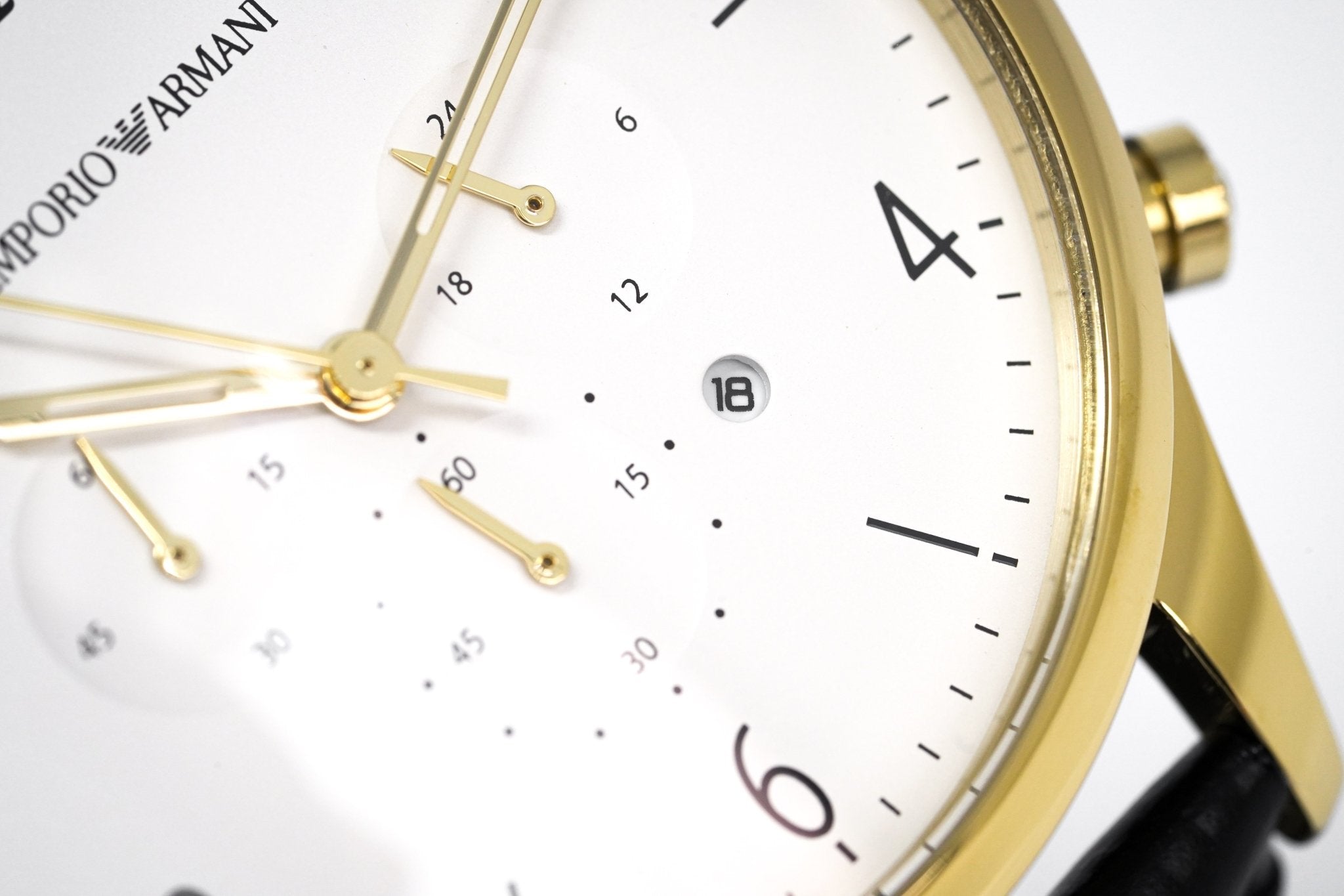 Emporio Armani AR1892 is a functional and handsome Gents watch . Material of the case is PVD Gold plated and the White dial gives the watch that unique look. The features of the watch include (among others) a chronograph and date function. This model has got 50 meters water resistance – it can be submerged in water for periods, so can be used for swimming and fishing. It is not recommended for high impact water sports. The watch is shipped with an original box and a guarantee from the manufacturer.