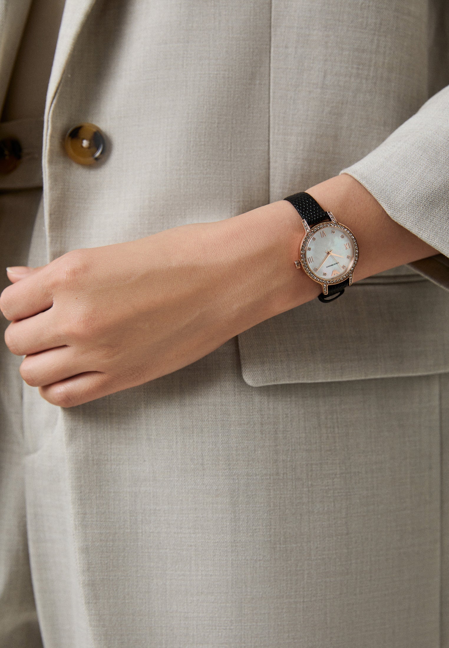 Emporio Armani's 32mm watch features a white mother of pearl glossy dial, stainless steel case with crystals, three-hand movement and black leather strap.