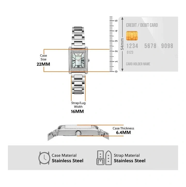 - Case Size: 22x32 mm, Dial Color: Mother Of Pearl, Case material: Gold Tone Stainless Steel, Case Thickness: 6.4 mm, Case Color: Silver.