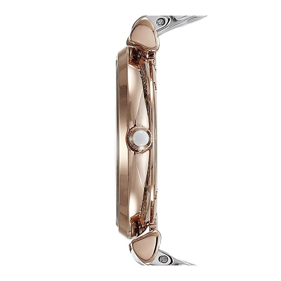 This Emporio Armani Ladies Gianni T-bar watch showcases a beautiful 32mm Stainless Steel case with scratch-resistant Mineral glass and a stunning Champagne coloured dial featuring baton hour markers and protected by a smooth set bezel.