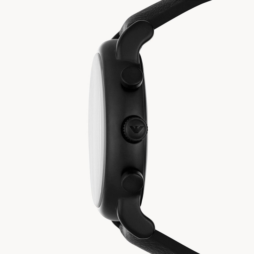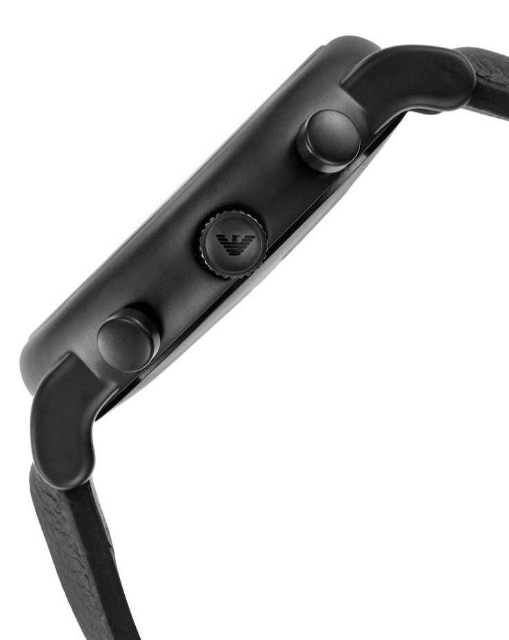 This 46mm Emporio Armani watch features a blue dial with black stick indexes, chronograph movement and black leather strap
