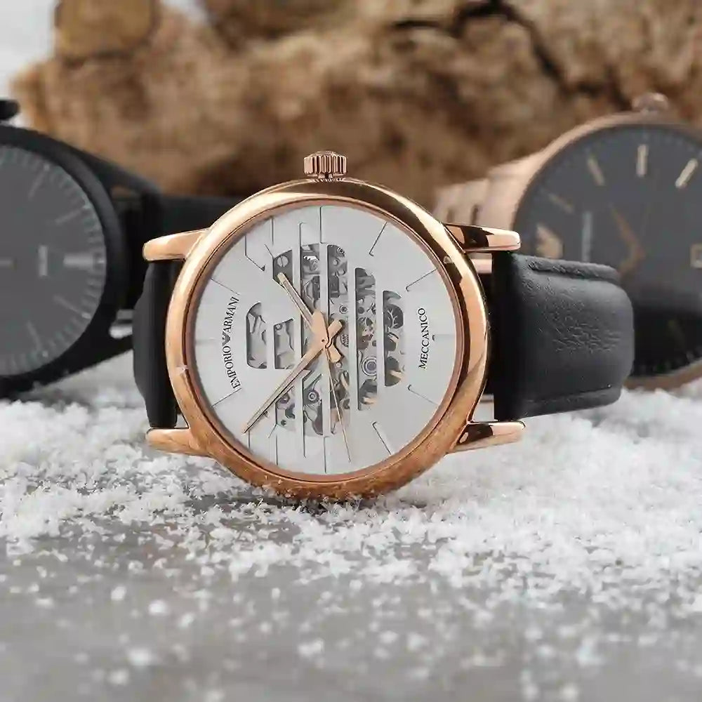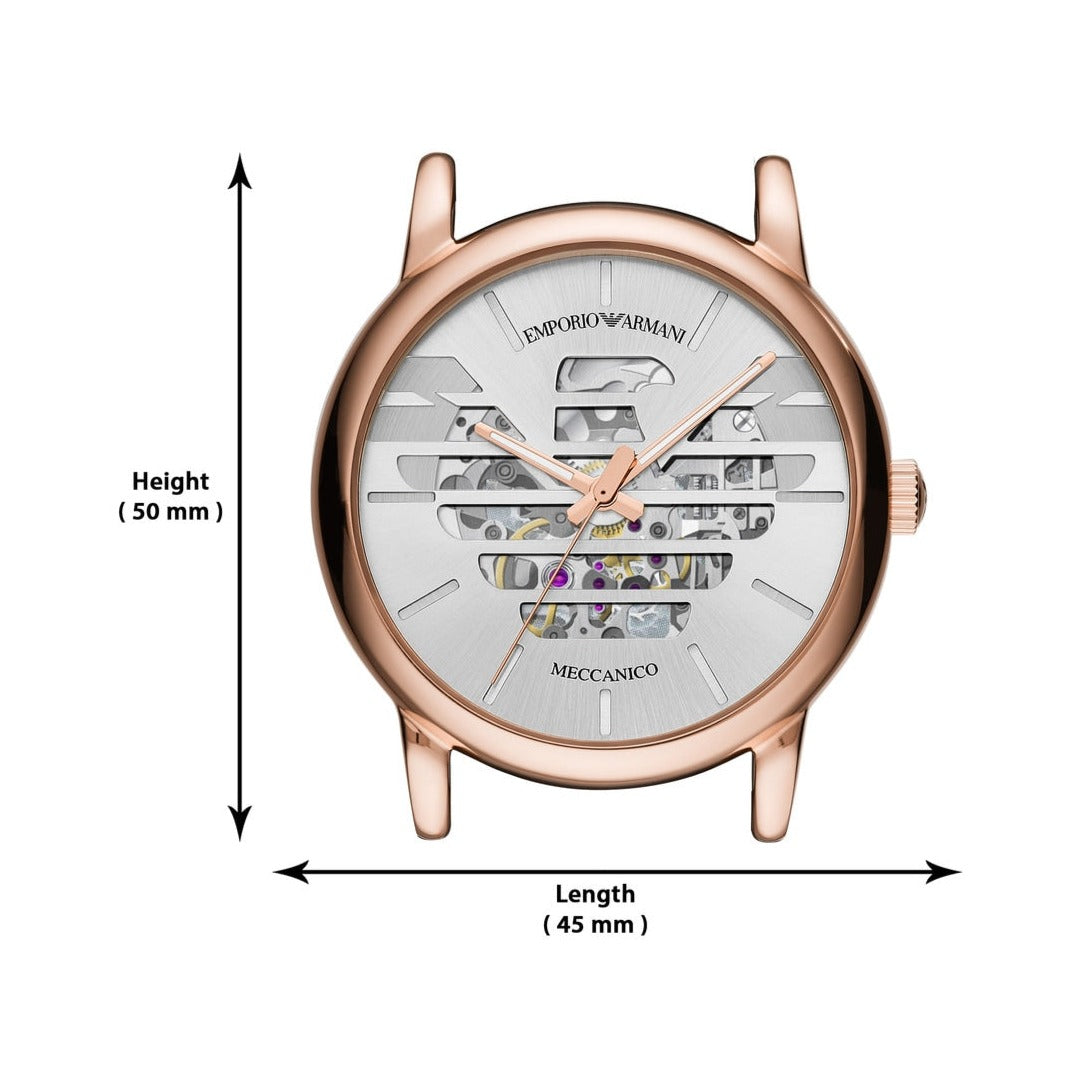 Silver (Emporio Armani Eagle Cut-out) dial enhanced by rose gold-tone hands. Rose Gold-tone stainless steel case with a black leather band. Automatic movement. 50 meters / 165 feet water resistance. Fixed bezel. Scratch Resistant Mineral crystal. Transparent caseback. Tang clasp. Pull / Push crown. Case size 43 mm. Band 22 mm x long. Emporio Armani AR60031 Luigi Watch.