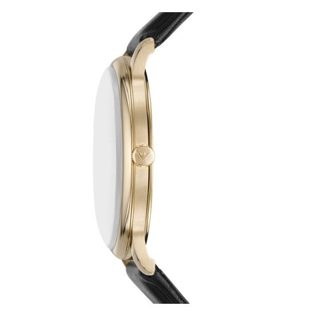 The Emporio Armani AR11601 Minimalist Watch is a perfect blend of elegance and simplicity. Featuring a 41mm gold-tone stainless steel case and a striking green dial, this watch stands out as a refined accessory for any occasion. The black leather band, with a 21mm width, adds a classic touch, while the reliable quartz movement ensures precise timekeeping. Designed with a water resistance of up to 50 meters and equipped with a secure buckle clasp, this timepiece is as practical as it is stylish, making it an ideal choice for the modern gentleman.