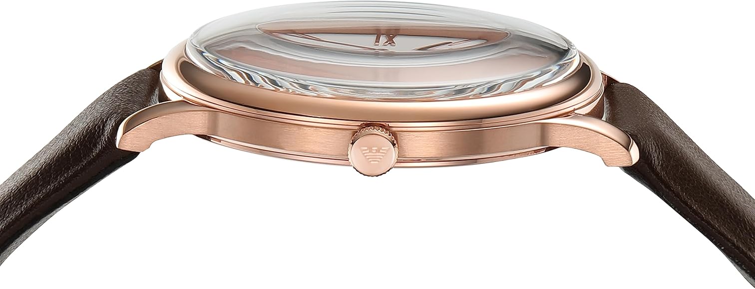 Emporio Armani's 42mm watch features a white matte dial, three-hand date movement, and a brown leather strap.